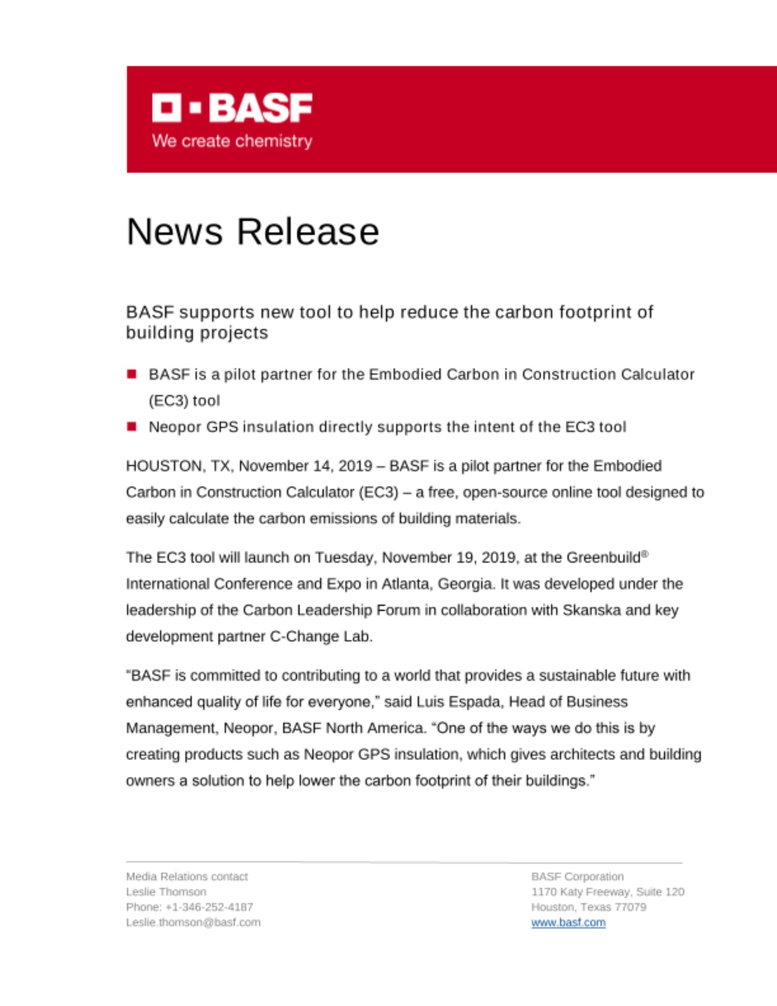 HOUSTON, TX, November 14, 2019 – BASF is a pilot partner for the Embodied Carbon in Construction Calculator (EC3) – a free, open-source online tool designed to easily calculate the carbon emissions of building materials.