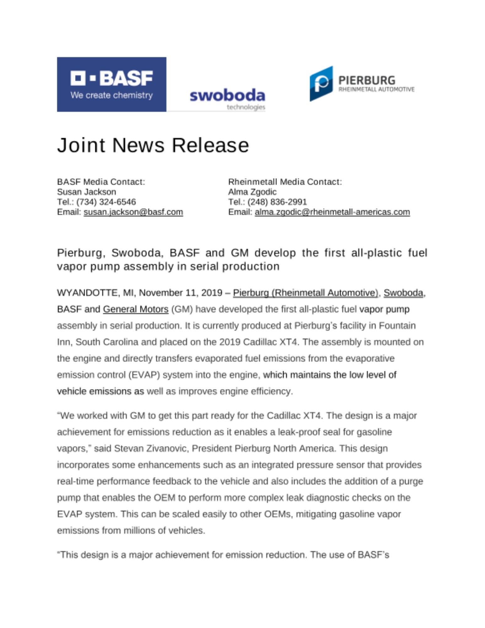 WYANDOTTE, MI, November 11, 2019 – Pierburg (Rheinmetall Automotive), Swoboda, BASF and General Motors (GM) have developed the first all-plastic fuel vapor pump assembly in serial production. It is currently produced at Pierburg’s facility in Fountain Inn, South Carolina and placed on the 2019 Cadillac XT4. The assembly is mounted on the engine and directly transfers evaporated fuel emissions from the evaporative emission control (EVAP) system into the engine, which maintains the low level of vehicle emissions as well as improves engine efficiency.