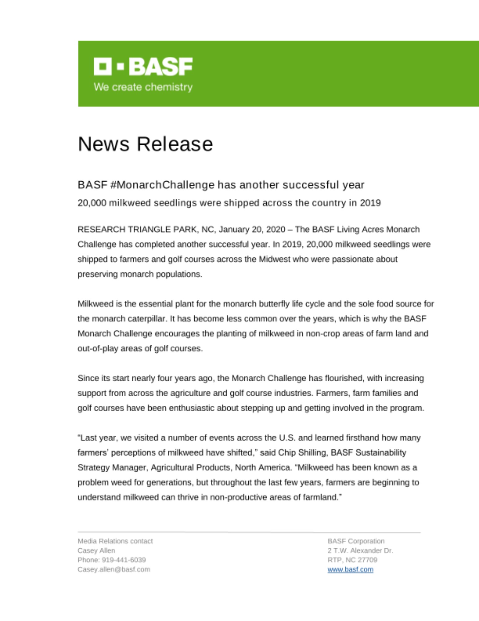 RESEARCH TRIANGLE PARK, NC, January 20, 2020 – The BASF Living Acres Monarch Challenge has completed another successful year. In 2019, 20,000 milkweed seedlings were shipped to farmers and golf courses across the Midwest who were passionate about preserving monarch populations.