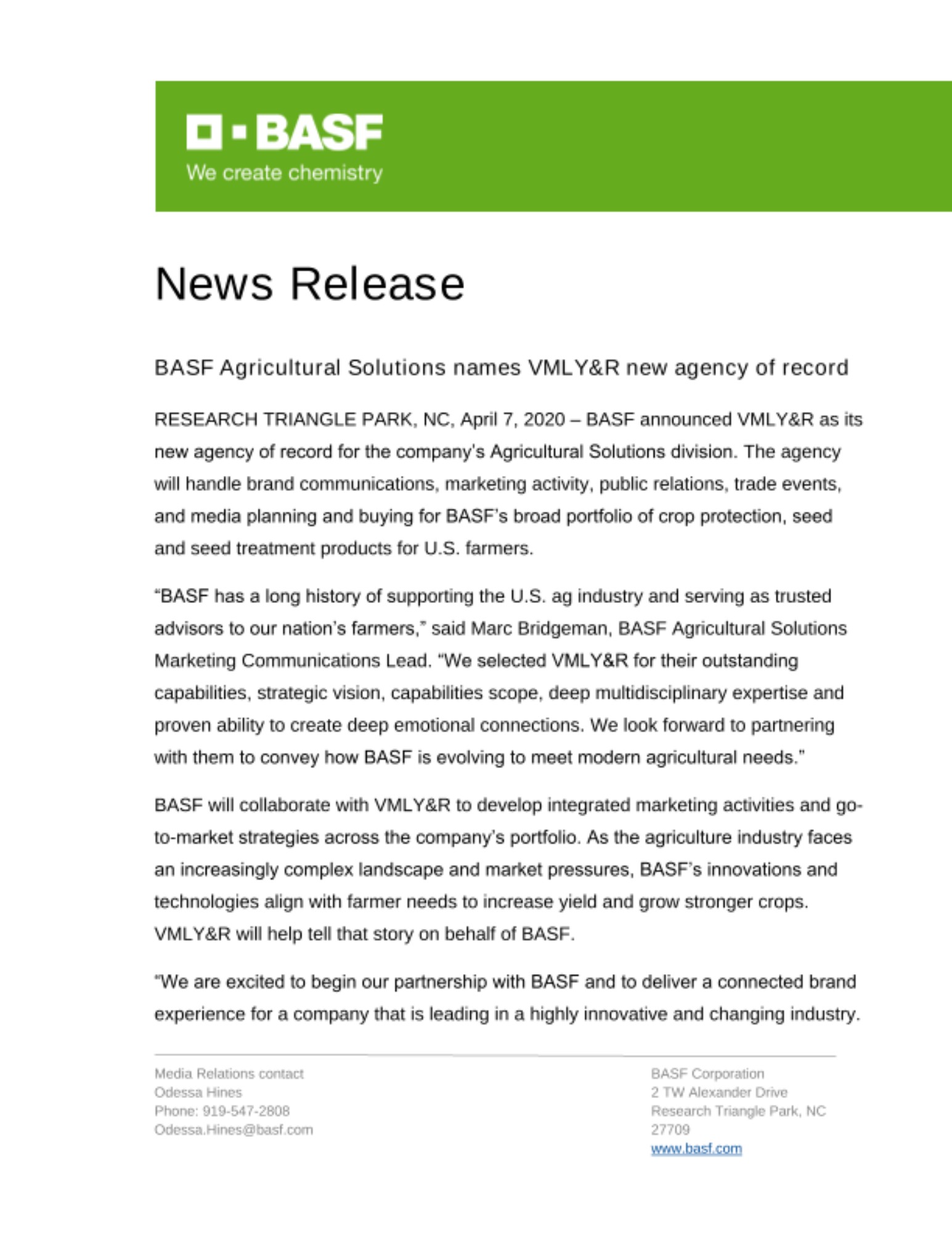 “BASF has a long history of supporting the U.S. ag industry and serving as trusted advisors to our nation’s farmers,” said Marc Bridgeman, BASF Agricultural Solutions Marketing Communications Lead. “We selected VMLY&R for their outstanding capabilities, strategic vision, capabilities scope, deep multidisciplinary expertise and proven ability to create deep emotional connections. We look forward to partnering with them to convey how BASF is evolving to meet modern agricultural needs.”