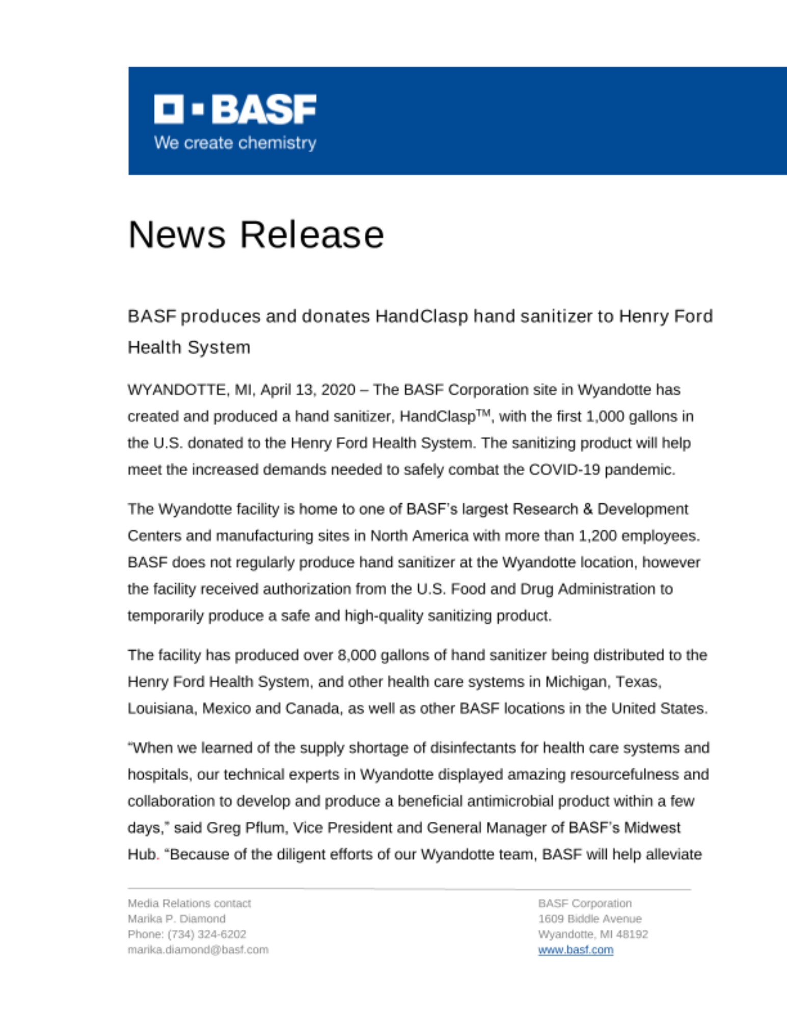 WYANDOTTE, MI, April 13, 2020 – The BASF Corporation site in Wyandotte has created and produced a hand sanitizer, HandClaspTM, with the first 1,000 gallons in the U.S. donated to the Henry Ford Health System. The sanitizing product will help meet the increased demands needed to safely combat the COVID-19 pandemic.