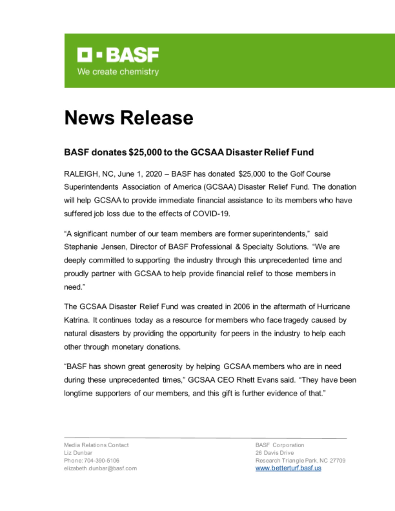 RALEIGH, NC, June 1, 2020 – BASF has donated $25,000 to the Golf Course Superintendents Association of America (GCSAA) Disaster Relief Fund. The donation will help GCSAA to provide immediate financial assistance to its members who have suffered job loss due to the effects of COVID-19.