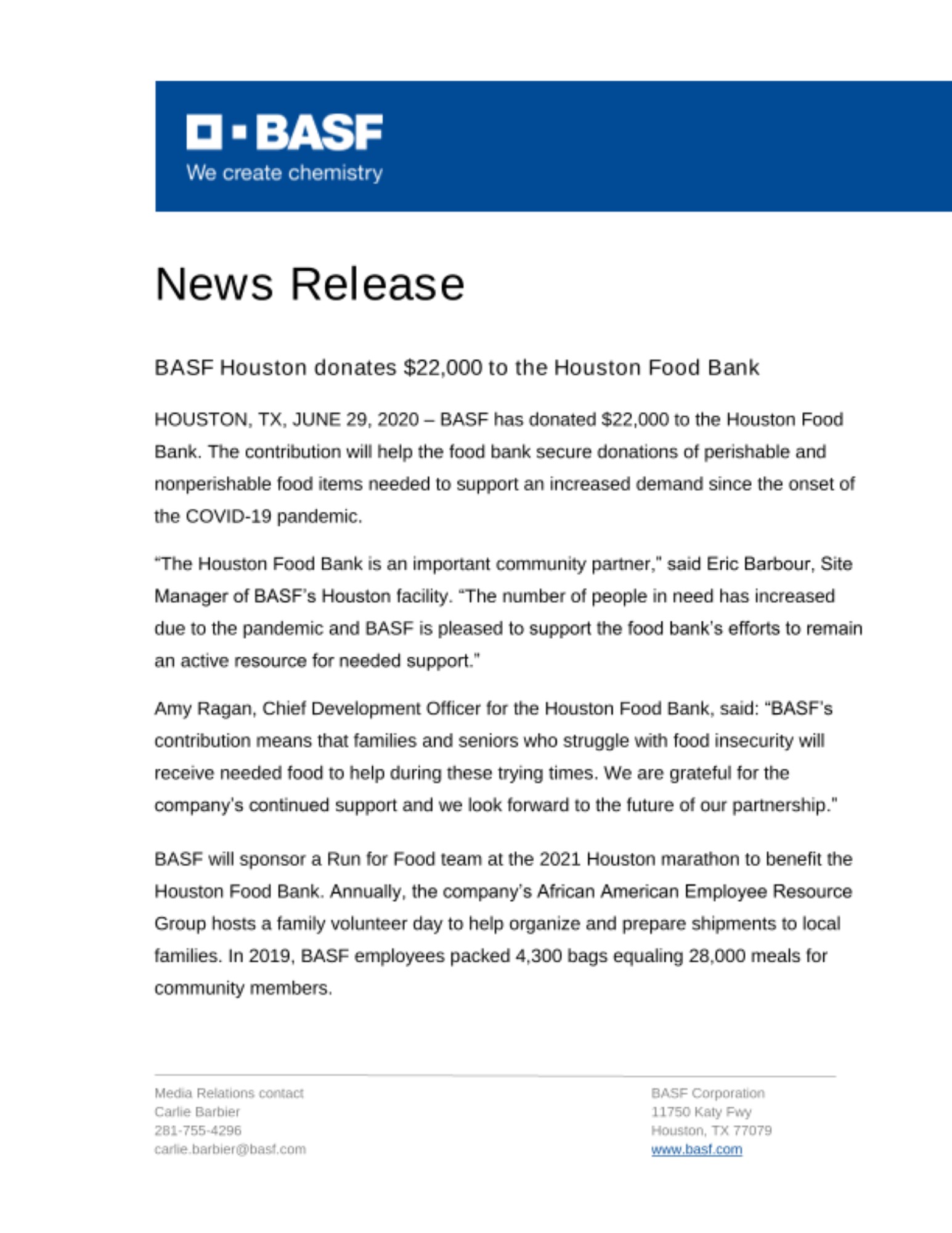 Amy Ragan, Chief Development Officer for the Houston Food Bank, said: “BASF’s contribution means that families and seniors who struggle with food insecurity will receive needed food to help during these trying times. We are grateful for the company’s continued support and we look forward to the future of our partnership.”
