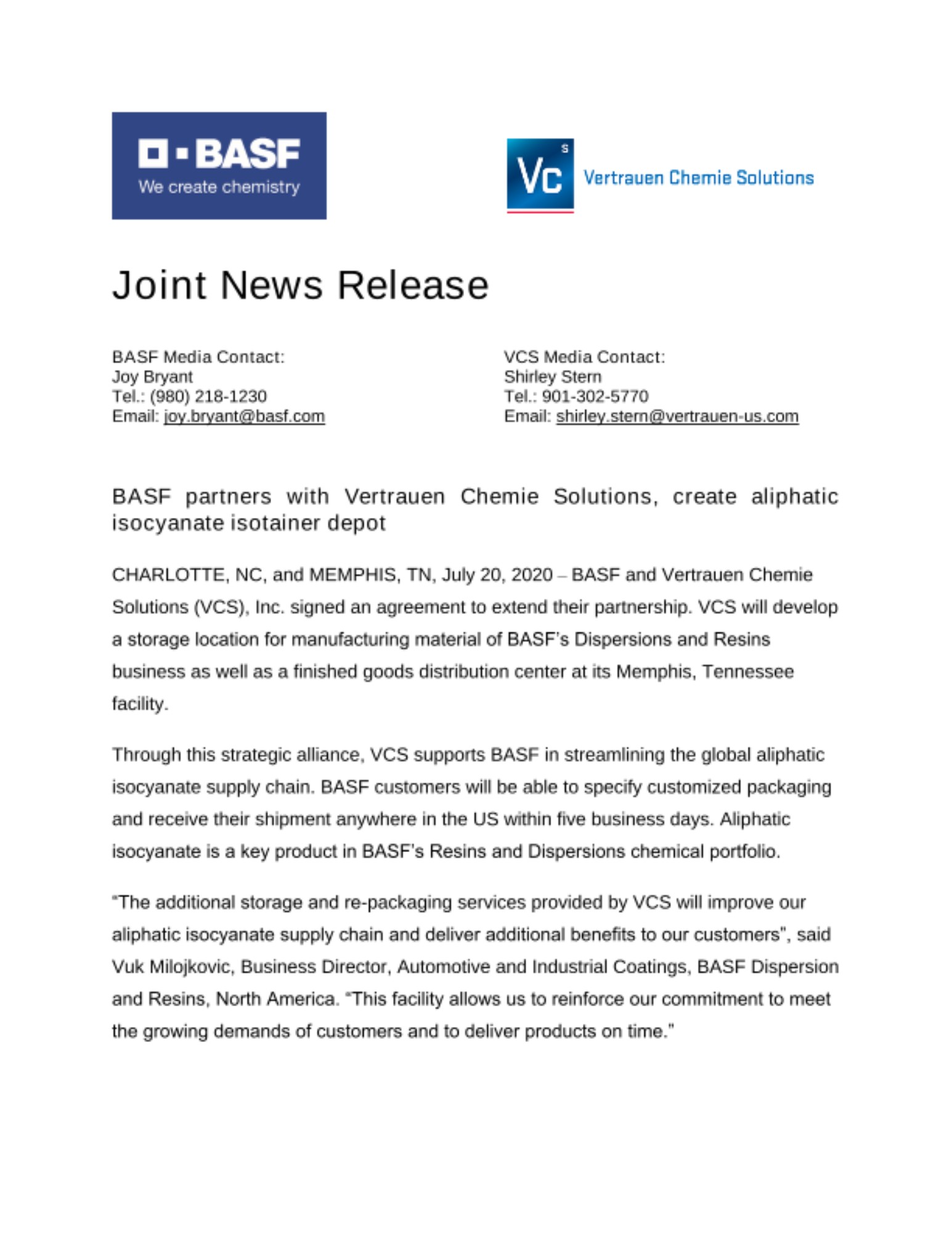 “The additional storage and re-packaging services provided by VCS will improve our aliphatic isocyanate supply chain and deliver additional benefits to our customers”, said Vuk Milojkovic, Business Director, Automotive and Industrial Coatings, BASF Dispersion and Resins, North America. “This facility allows us to reinforce our commitment to meet the growing demands of customers and to deliver products on time.”