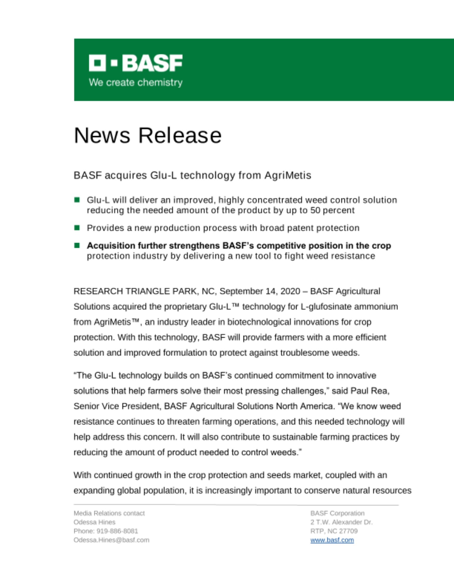 RESEARCH TRIANGLE PARK, NC, September 14, 2020 – BASF Agricultural Solutions acquired the proprietary Glu-L™ technology for L-glufosinate ammonium from AgriMetis™, an industry leader in biotechnological innovations for crop protection. With this technology, BASF will provide farmers with a more efficient solution and improved formulation to protect against troublesome weeds.