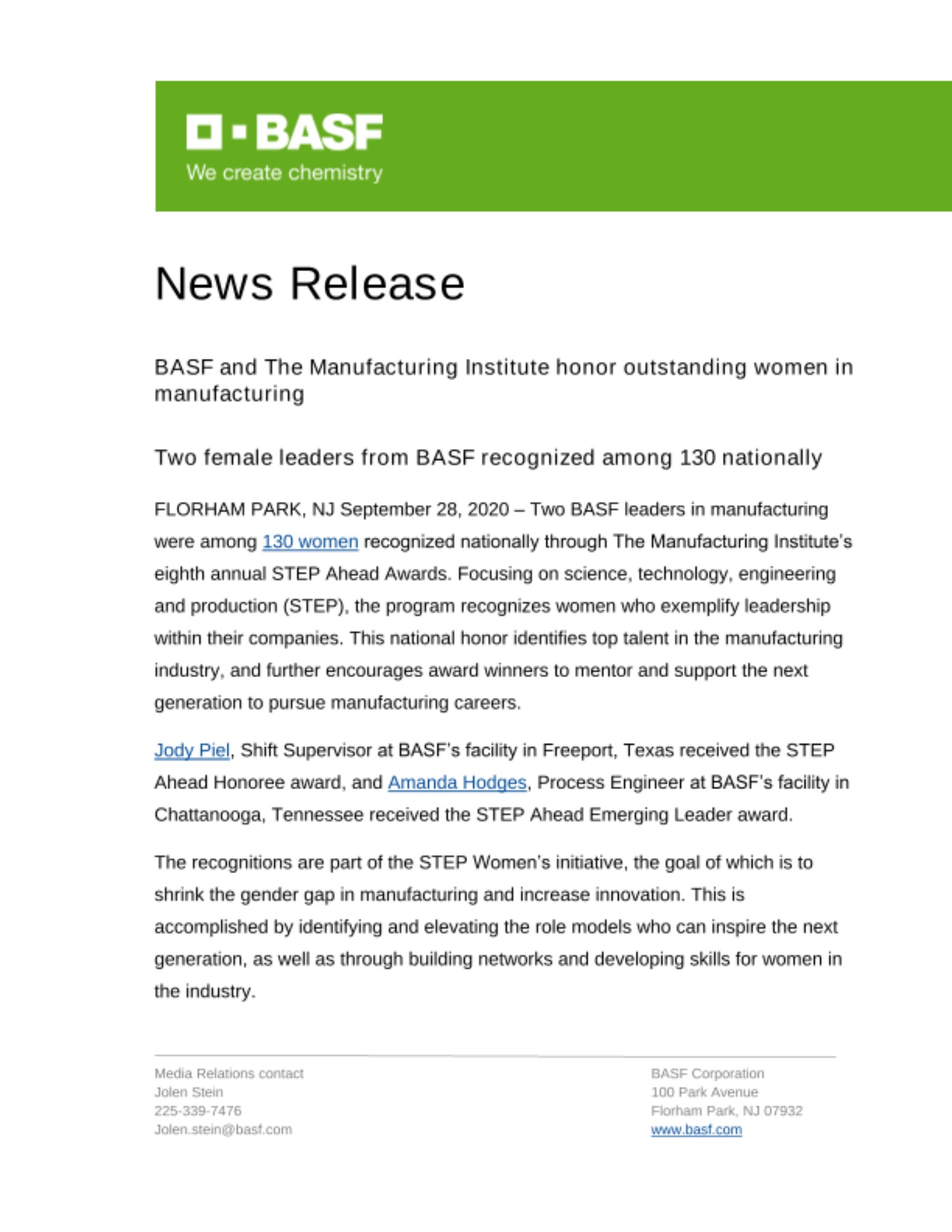 BASF sponsored the annual awards ceremony, which was held virtually on September 24. For more information about BASF careers and efforts that promote women in manufacturing, visit www.basf.us/women.