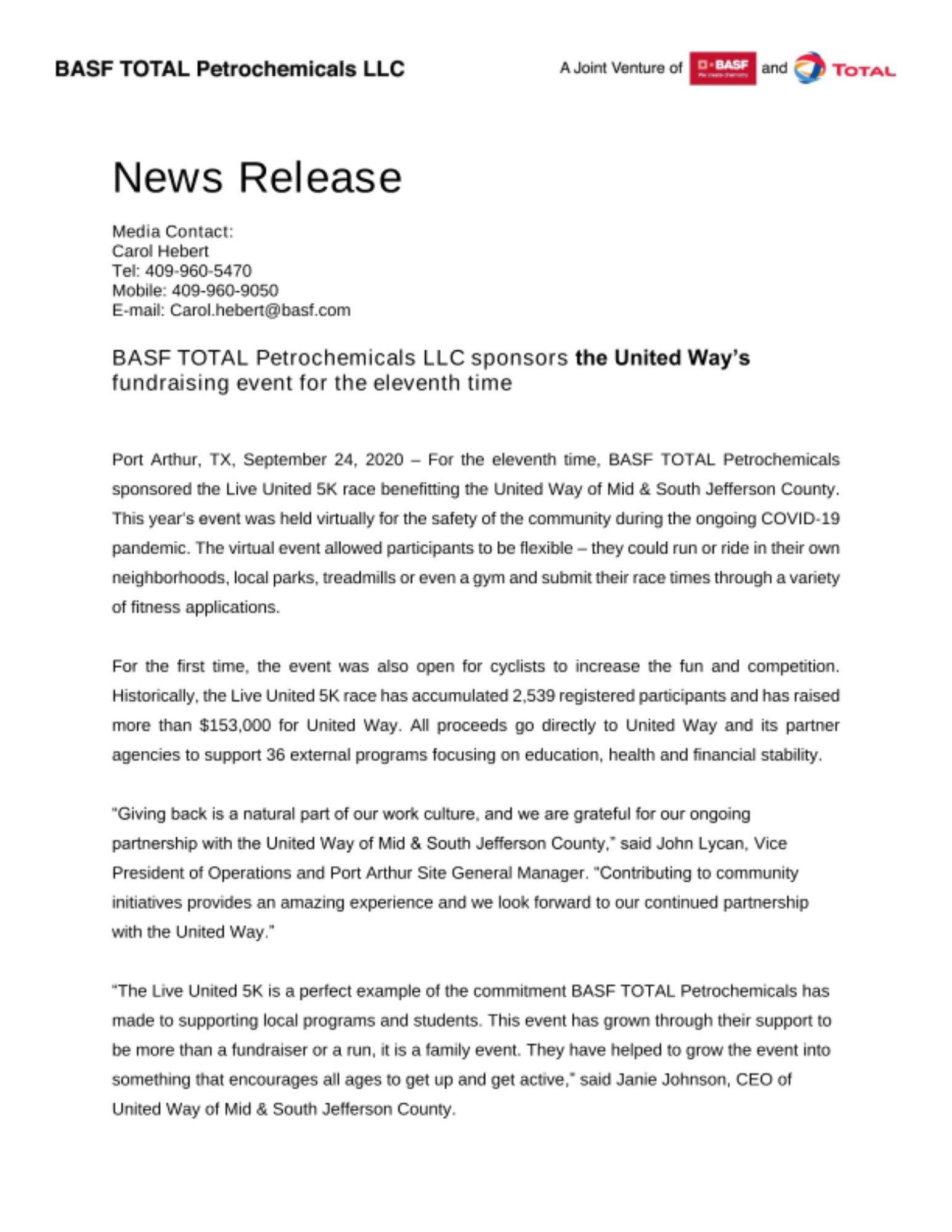 Port Arthur, TX, September 24, 2020 – For the eleventh time, BASF TOTAL Petrochemicals sponsored the Live United 5K race benefitting the United Way of Mid & South Jefferson County. This year‘s event was held virtually for the safety of the community during the ongoing COVID-19 pandemic. The virtual event allowed participants to be flexible – they could run or ride in their own neighborhoods, local parks, treadmills or even a gym and submit their race times through a variety of fitness applications.
