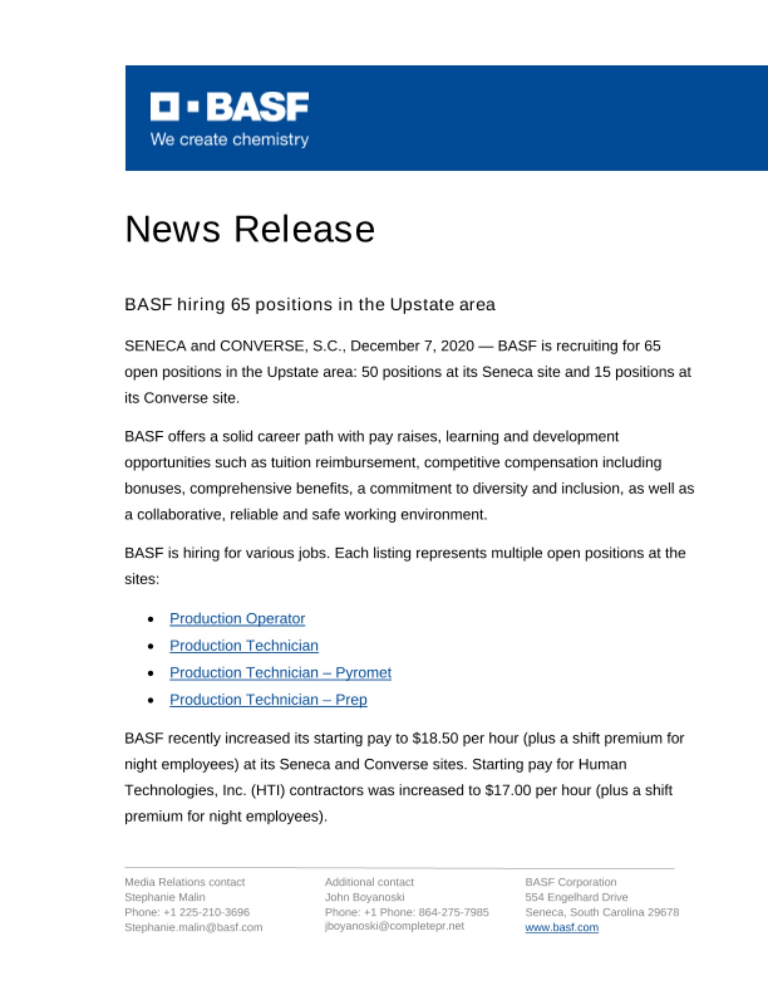 BASF recently increased its starting pay to $18.50 per hour (plus a shift premium for night employees) at its Seneca and Converse sites. Starting pay for Human Technologies, Inc. (HTI) contractors was increased to $17.00 per hour (plus a shift premium for night employees).