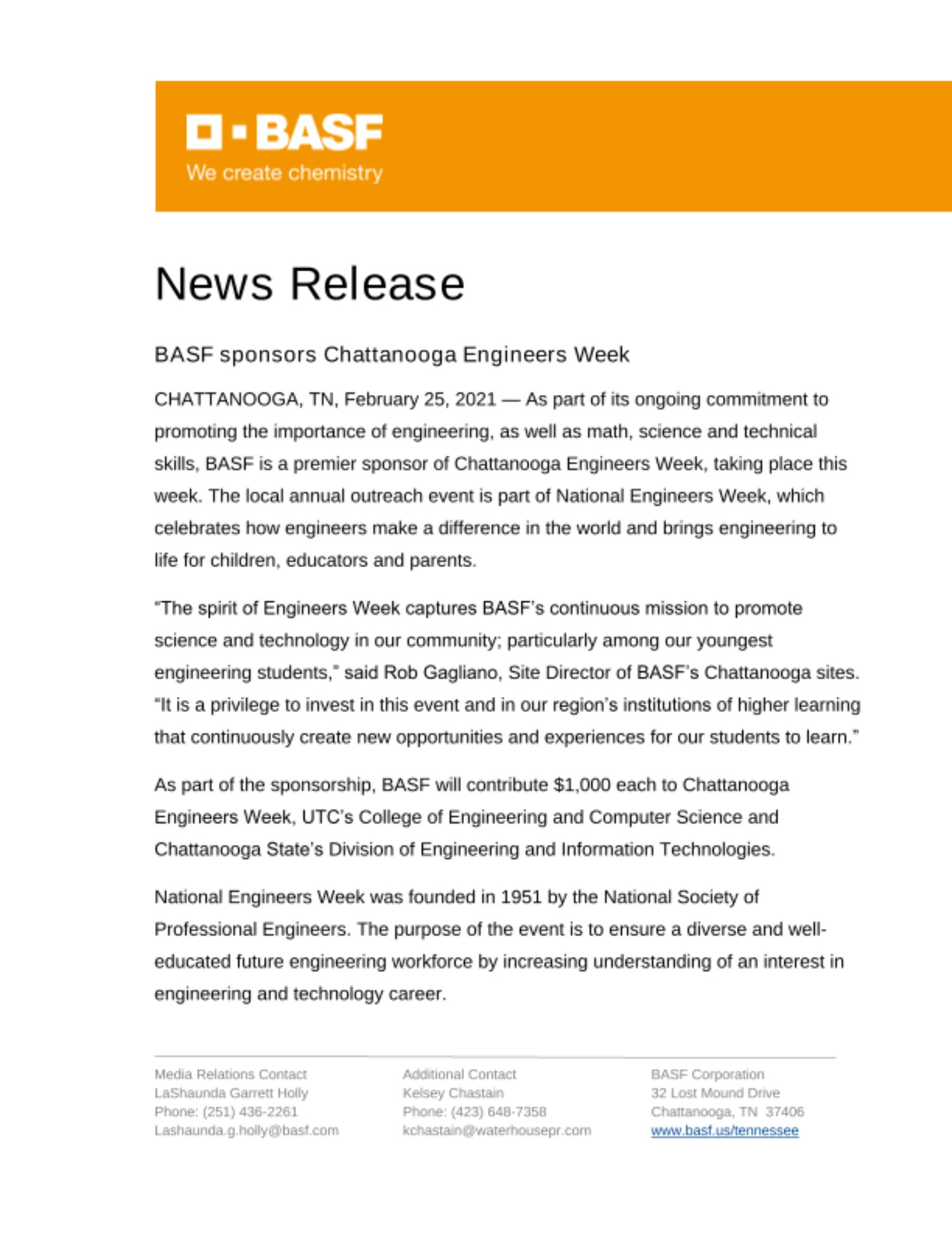 “The spirit of Engineers Week captures BASF’s continuous mission to promote science and technology in our community; particularly among our youngest engineering students,” said Rob Gagliano, Site Director of BASF’s Chattanooga sites. “It is a privilege to invest in this event and in our region’s institutions of higher learning that continuously create new opportunities and experiences for our students to learn.”