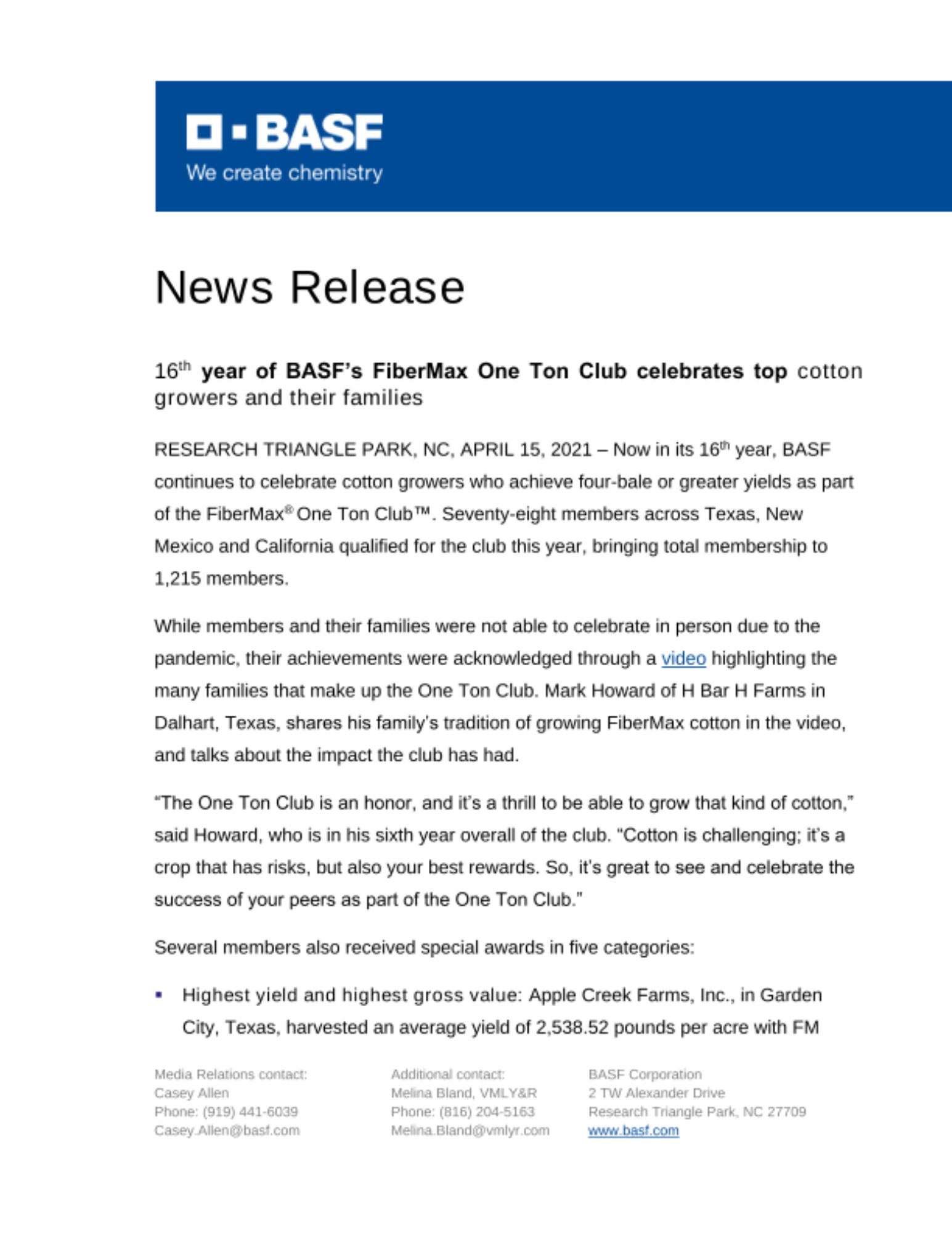 RESEARCH TRIANGLE PARK, NC, APRIL 15, 2021 – Now in its 16th year, BASF continues to celebrate cotton growers who achieve four-bale or greater yields as part of the FiberMax® One Ton Club™. Seventy-eight members across Texas, New Mexico and California qualified for the club this year, bringing total membership to 1,215 members.