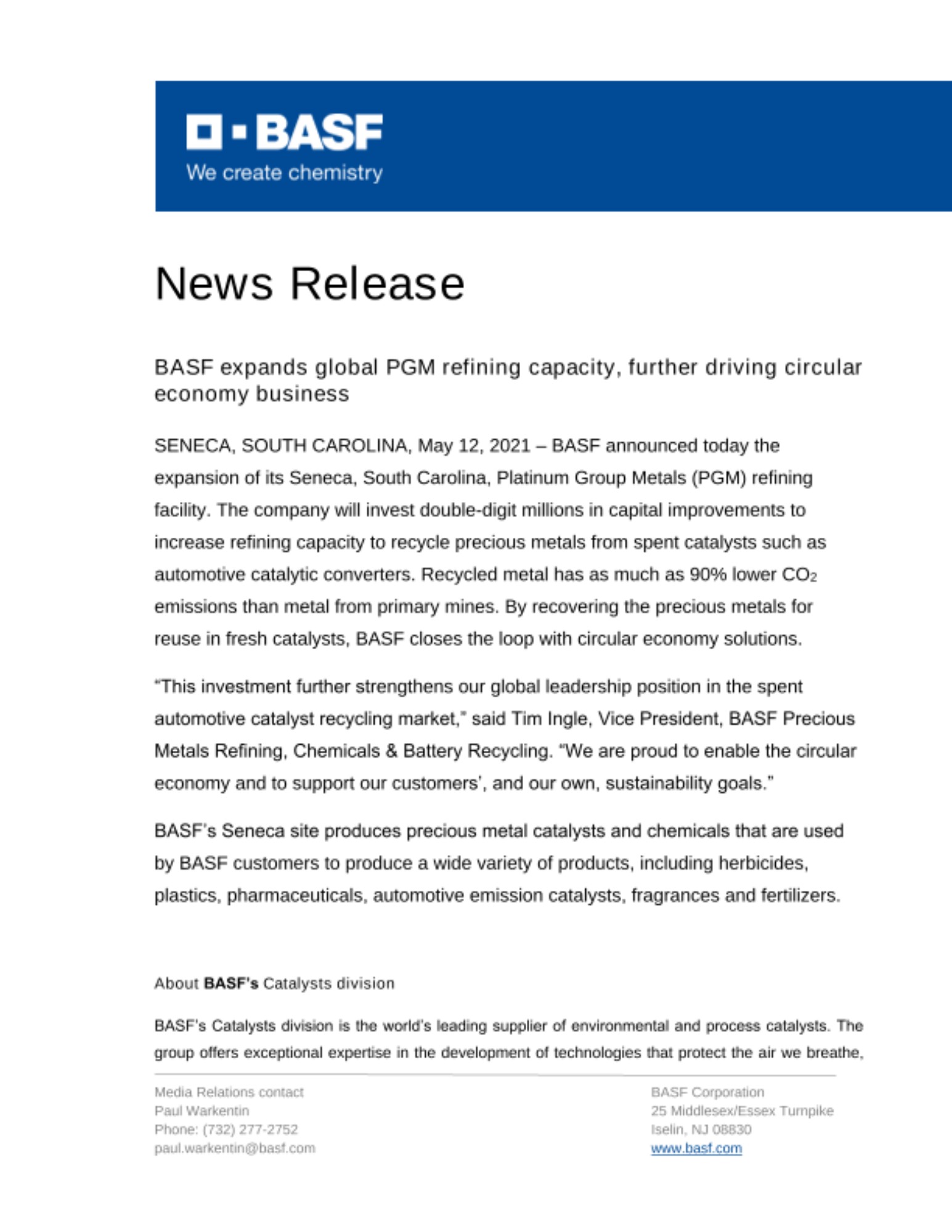 SENECA, SOUTH CAROLINA, May 12, 2021 – BASF announced today the expansion of its Seneca, South Carolina, Platinum Group Metals (PGM) refining facility. The company will invest double-digit millions in capital improvements to increase refining capacity to recycle precious metals from spent catalysts such as automotive catalytic converters. Recycled metal has as much as 90% lower CO2 emissions than metal from primary mines. By recovering the precious metals for reuse in fresh catalysts, BASF closes the loop with circular economy solutions.