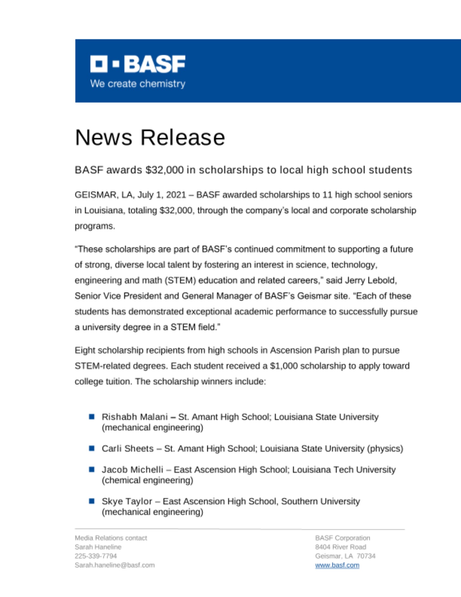 GEISMAR, LA, July 1, 2021 – BASF awarded scholarships to 11 high school seniors in Louisiana, totaling $32,000, through the company’s local and corporate scholarship programs.
