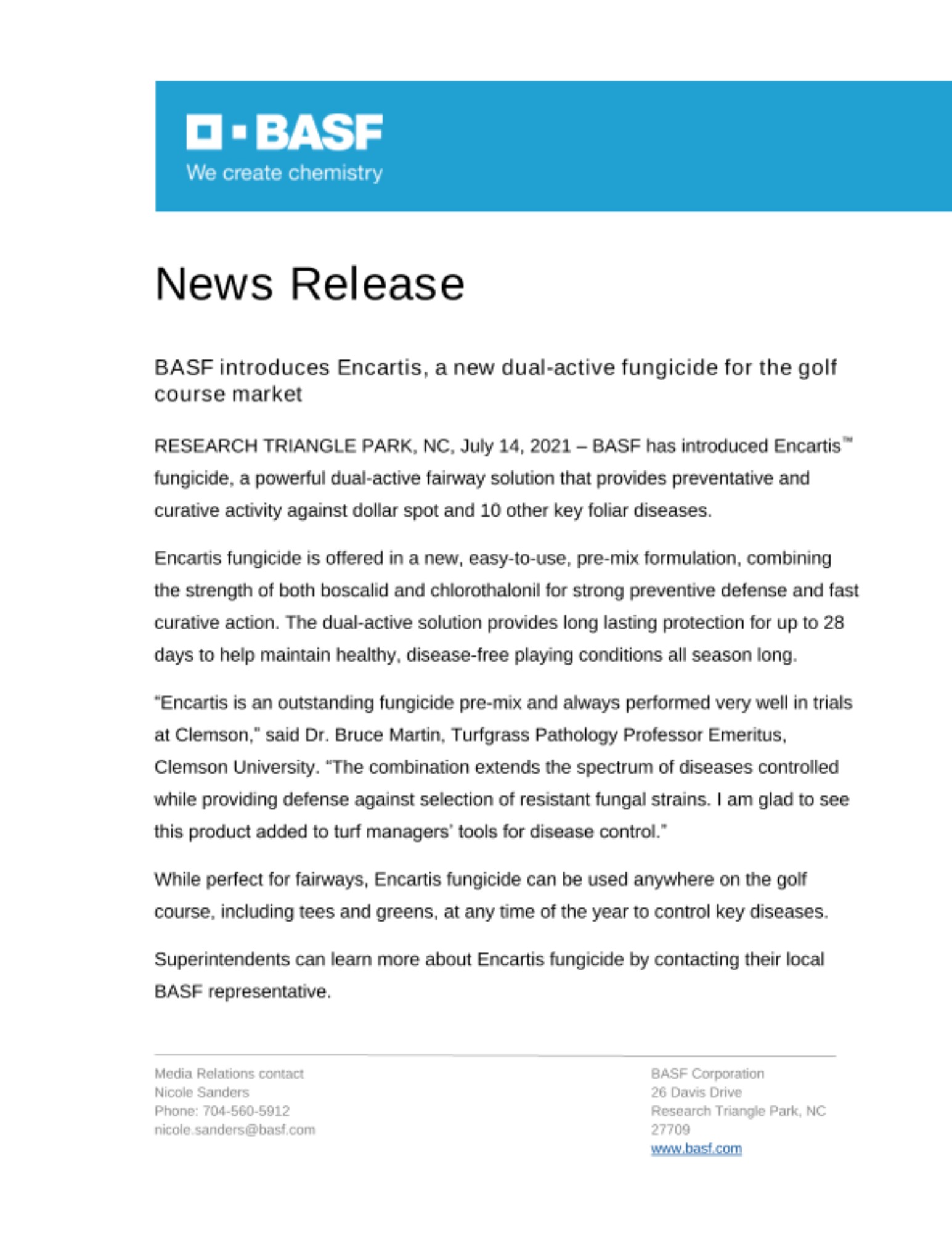 RESEARCH TRIANGLE PARK, NC, July 14, 2021 – BASF has introduced Encartis™ fungicide, a powerful dual-active fairway solution that provides preventative and curative activity against dollar spot and 10 other key foliar diseases.
