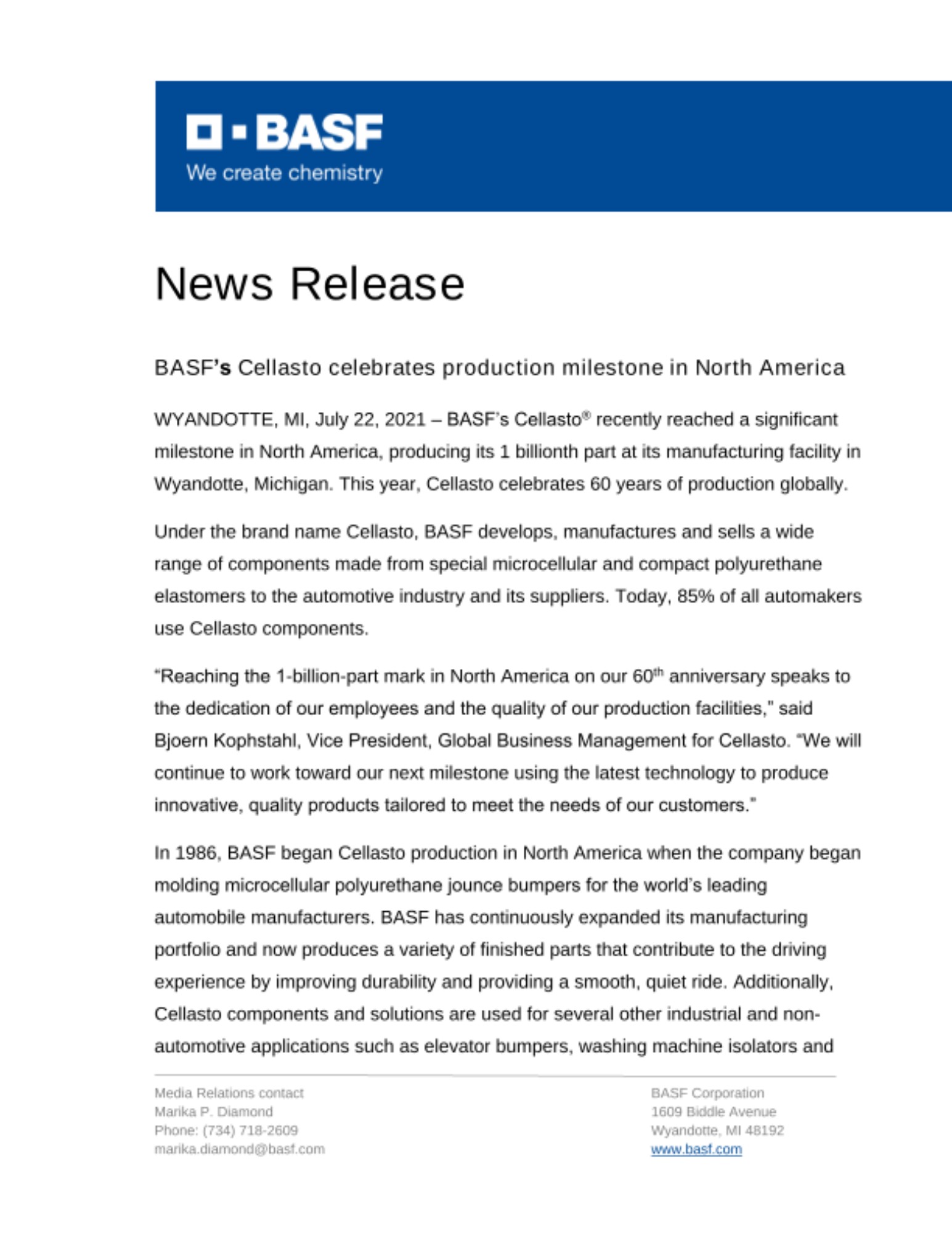 WYANDOTTE, MI, July 22, 2021 – BASF’s Cellasto® recently reached a significant milestone in North America, producing its 1 billionth part at its manufacturing facility in Wyandotte, Michigan. This year, Cellasto celebrates 60 years of production globally.