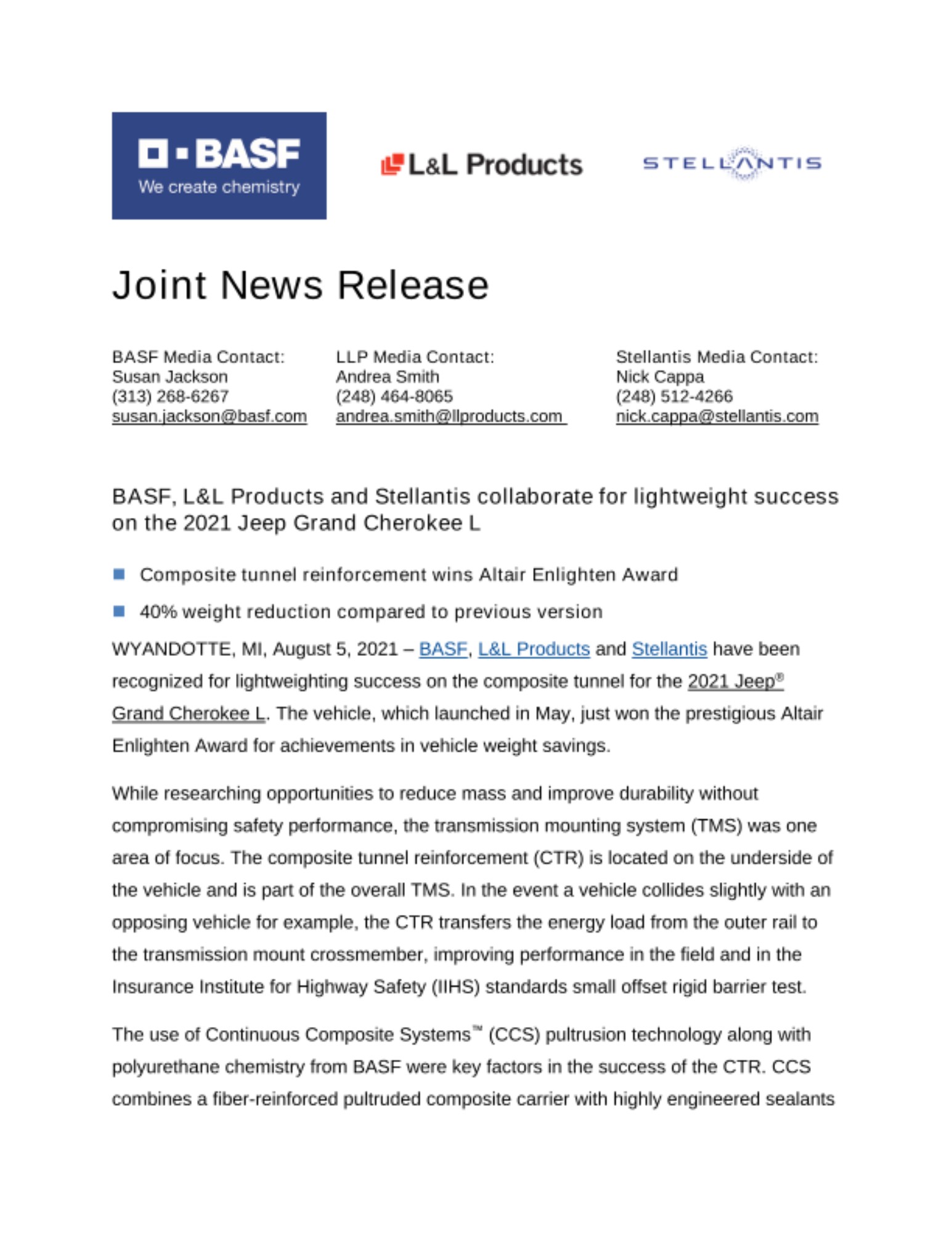 WYANDOTTE, MI, August 5, 2021 – BASF, L&L Products and Stellantis have been recognized for lightweighting success on the composite tunnel for the 2021 Jeep® Grand Cherokee L. The vehicle, which launched in May, just won the prestigious Altair Enlighten Award for achievements in vehicle weight savings.