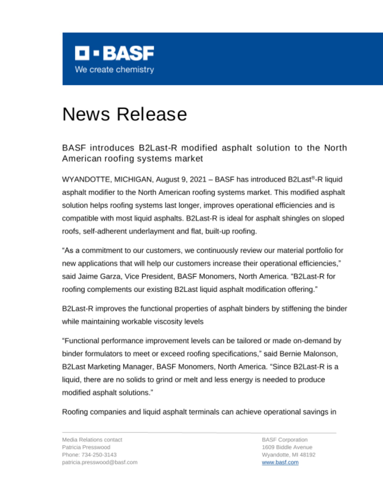 WYANDOTTE, MICHIGAN, August 9, 2021 – BASF has introduced B2Last®-R liquid asphalt modifier to the North American roofing systems market. This modified asphalt solution helps roofing systems last longer, improves operational efficiencies and is compatible with most liquid asphalts. B2Last-R is ideal for asphalt shingles on sloped roofs, self-adherent underlayment and flat, built-up roofing.