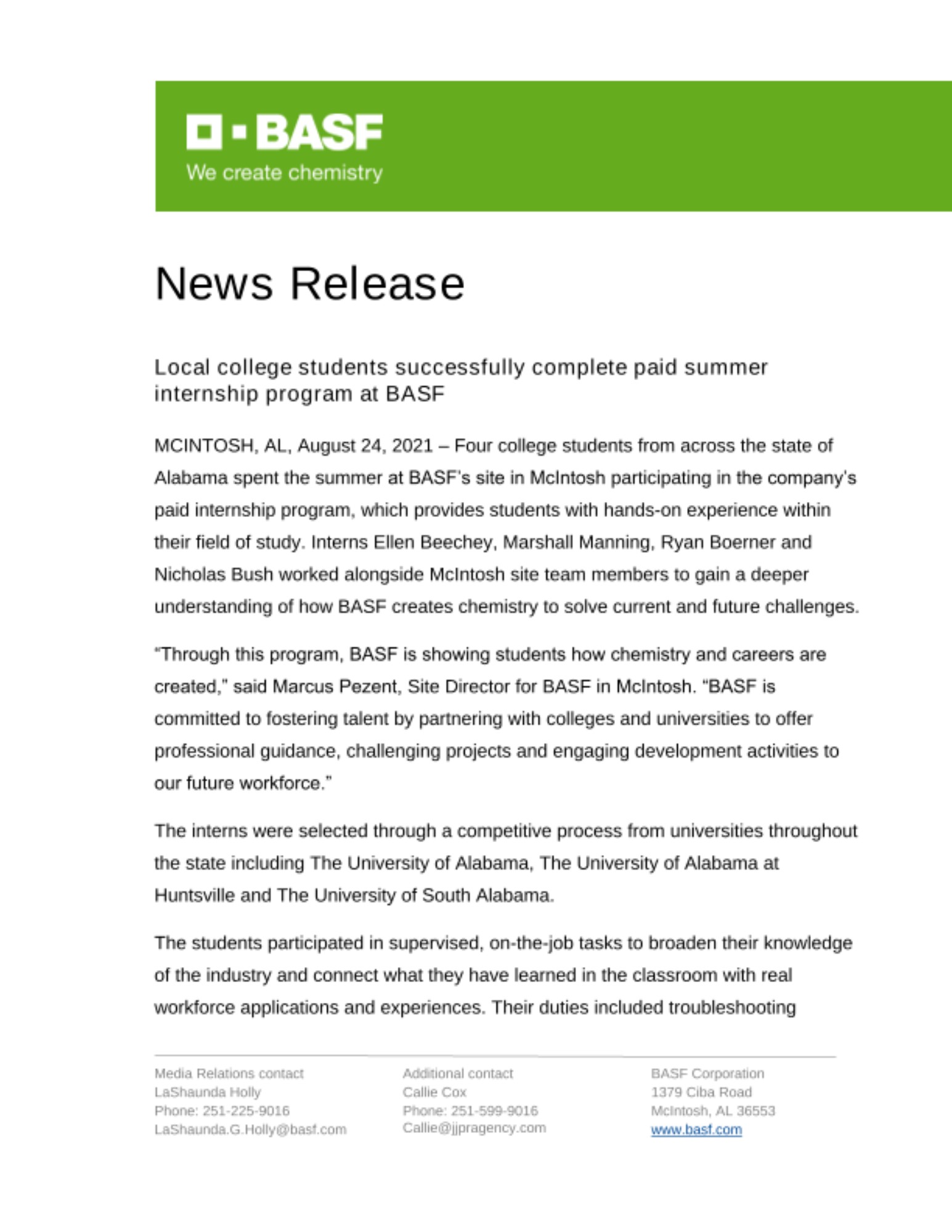 For more information about careers and internship opportunities at BASF, visit www.basf.us/alabama
