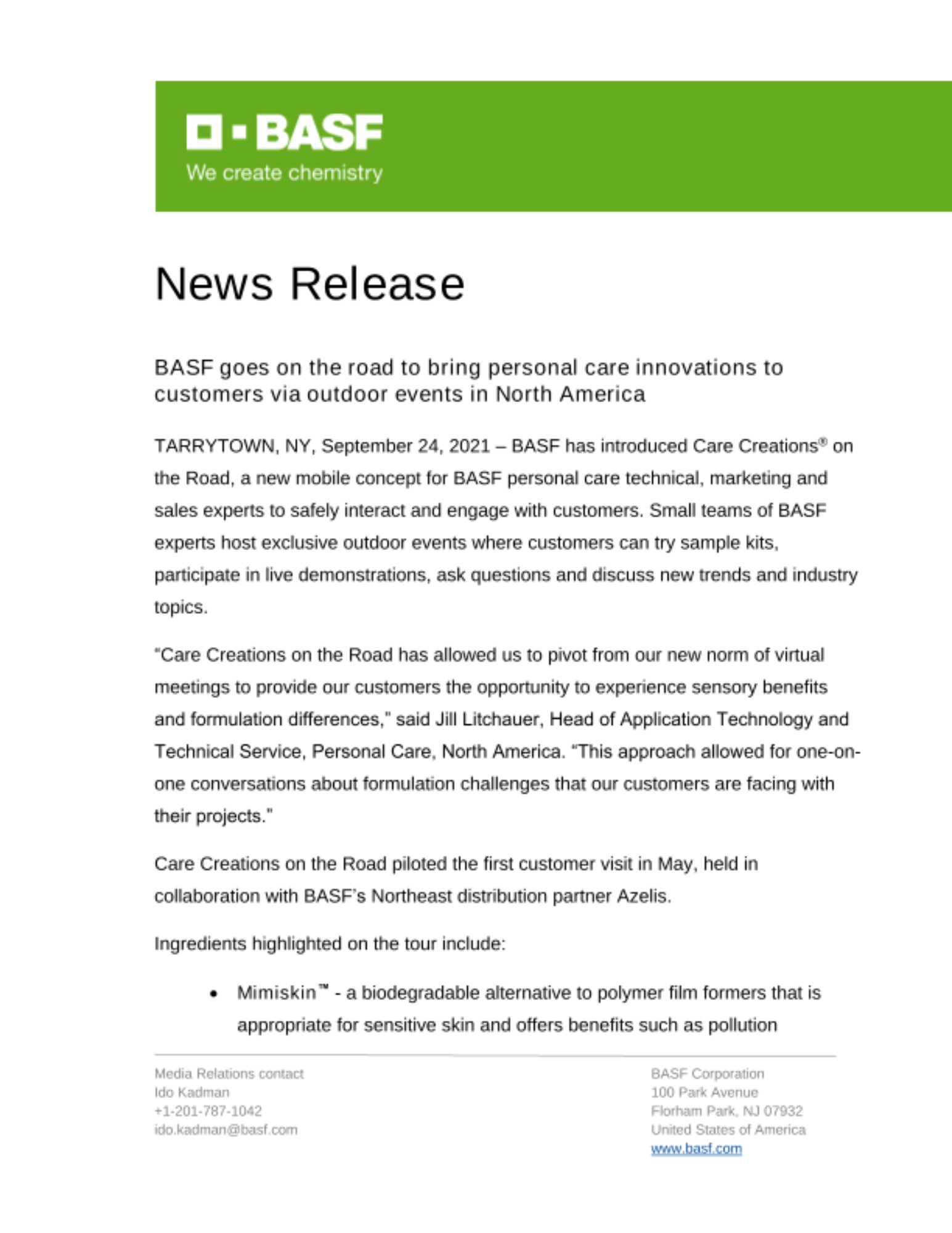 TARRYTOWN, NY, September 24, 2021 – BASF has introduced Care Creations® on the Road, a new mobile concept for BASF personal care technical, marketing and sales experts to safely interact and engage with customers. Small teams of BASF experts host exclusive outdoor events where customers can try sample kits, participate in live demonstrations, ask questions and discuss new trends and industry topics.
