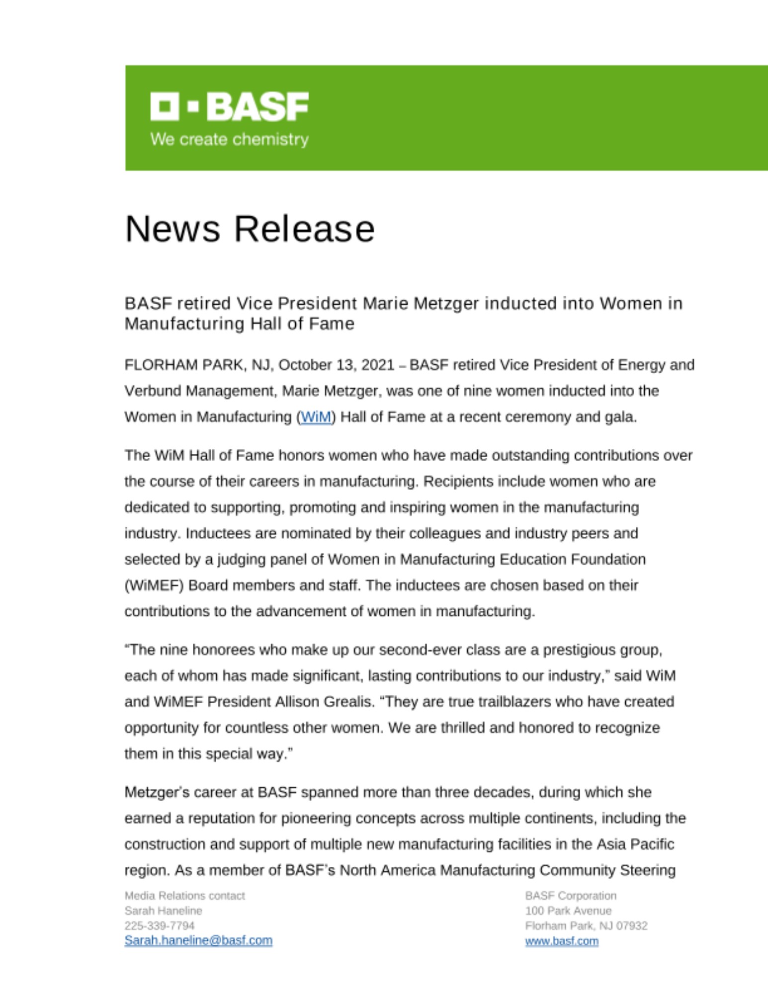 FLORHAM PARK, NJ, October 13, 2021 – BASF retired Vice President of Energy and Verbund Management, Marie Metzger, was one of nine women inducted into the Women in Manufacturing ( WiM) Hall of Fame at a recent ceremony and gala.