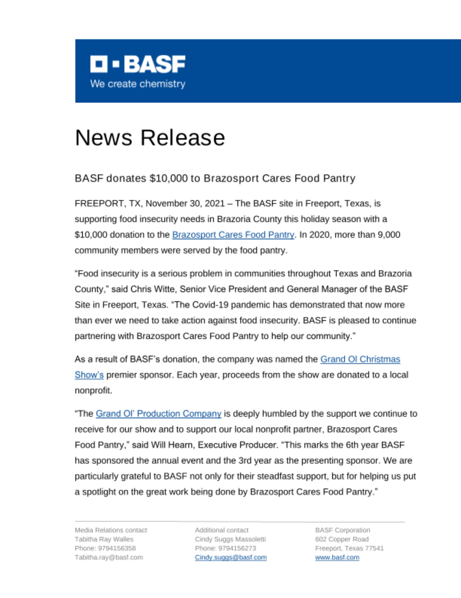 “The Grand Ol’ Production Company is deeply humbled by the support we continue to receive for our show and to support our local nonprofit partner, Brazosport Cares Food Pantry,” said Will Hearn, Executive Producer. “This marks the 6th year BASF has sponsored the annual event and the 3rd year as the presenting sponsor. We are particularly grateful to BASF not only for their steadfast support, but for helping us put a spotlight on the great work being done by Brazosport Cares Food Pantry.”