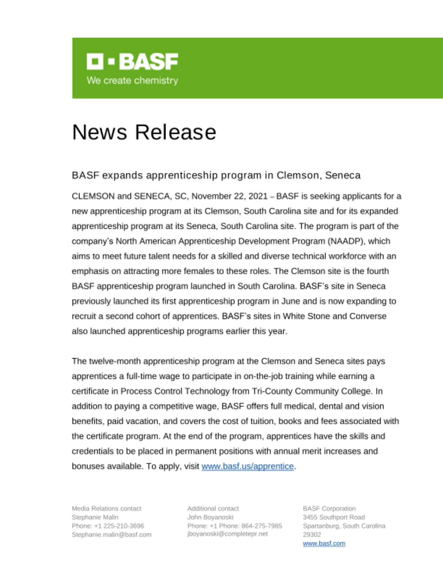 CLEMSON and SENECA, SC, November 22, 2021 – BASF is seeking applicants for a new apprenticeship program at its Clemson, South Carolina site and for its expanded apprenticeship program at its Seneca, South Carolina site. The program is part of the company’s North American Apprenticeship Development Program (NAADP), which aims to meet future talent needs for a skilled and diverse technical workforce with an emphasis on attracting more females to these roles. The Clemson site is the fourth BASF apprenticeship program launched in South Carolina. BASF’s site in Seneca previously launched its first apprenticeship program in June and is now expanding to recruit a second cohort of apprentices. BASF’s sites in White Stone and Converse also launched apprenticeship programs earlier this year.