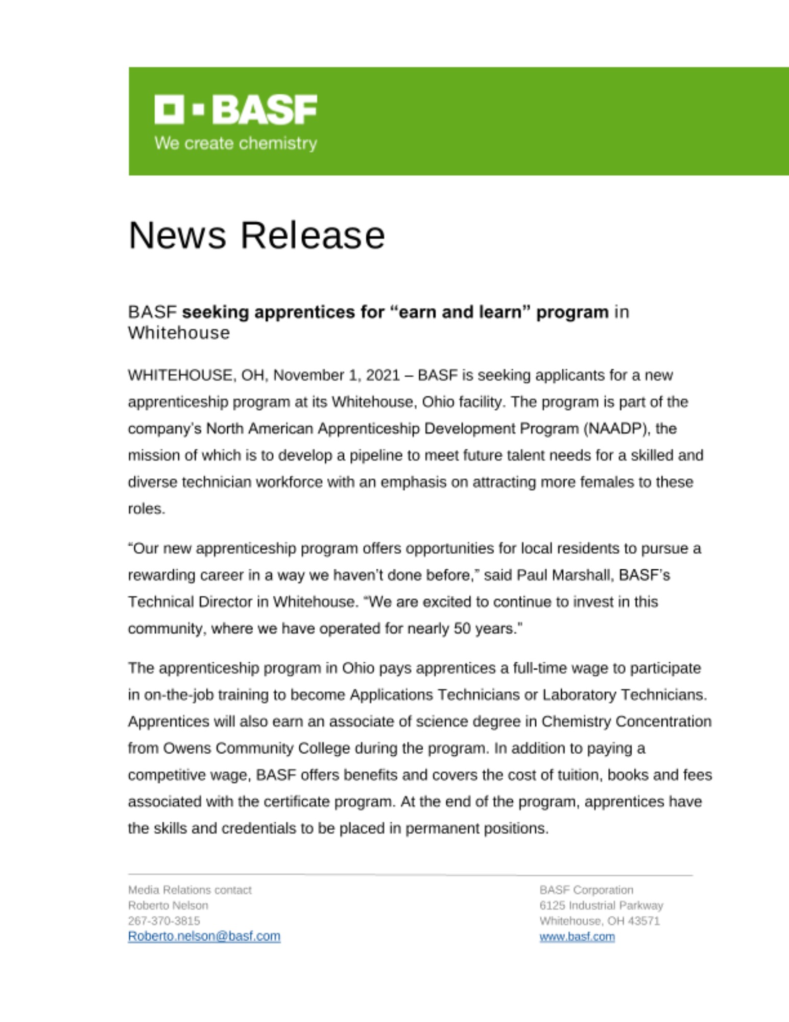 “Our new apprenticeship program offers opportunities for local residents to pursue a rewarding career in a way we haven’t done before,” said Paul Marshall, BASF’s Technical Director in Whitehouse. “We are excited to continue to invest in this community, where we have operated for nearly 50 years.”
