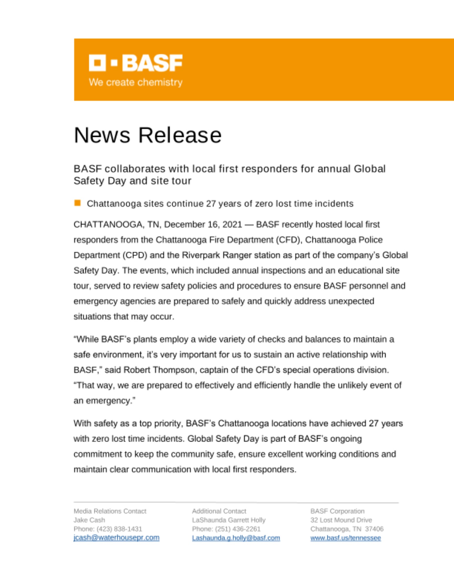 With safety as a top priority, BASF’s Chattanooga locations have achieved 27 years with zero lost time incidents. Global Safety Day is part of BASF’s ongoing commitment to keep the community safe, ensure excellent working conditions and maintain clear communication with local first responders.