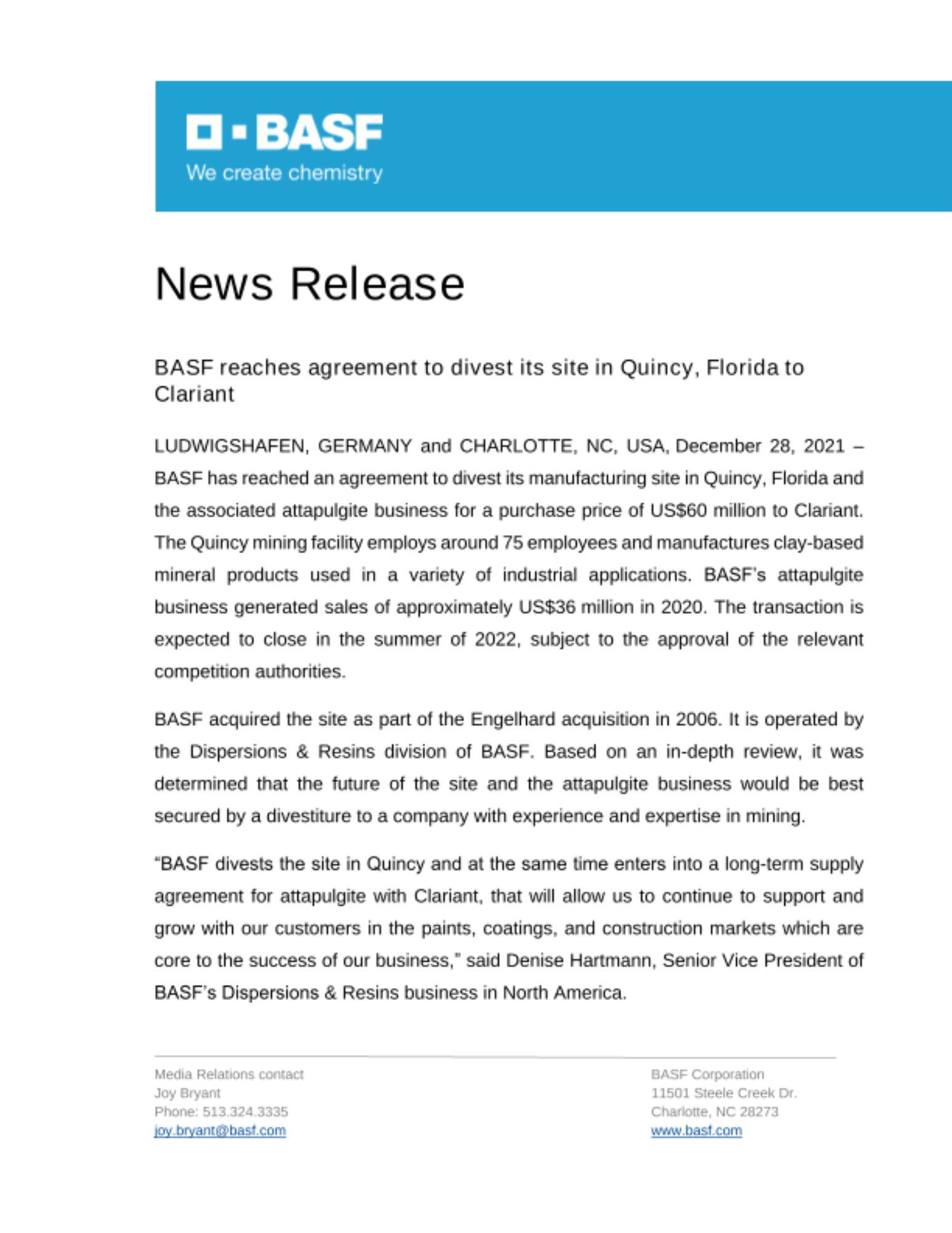 LUDWIGSHAFEN, GERMANY and CHARLOTTE, NC, USA, December 28, 2021 – BASF has reached an agreement to divest its manufacturing site in Quincy, Florida and the associated attapulgite business for a purchase price of US$60 million to Clariant. The Quincy mining facility employs around 75 employees and manufactures clay-based mineral products used in a variety of industrial applications. BASF’s attapulgite business generated sales of approximately US $36 million in 2020. The transaction is expected to close in the summer of 2022, subject to the approval of the relevant competition authorities.