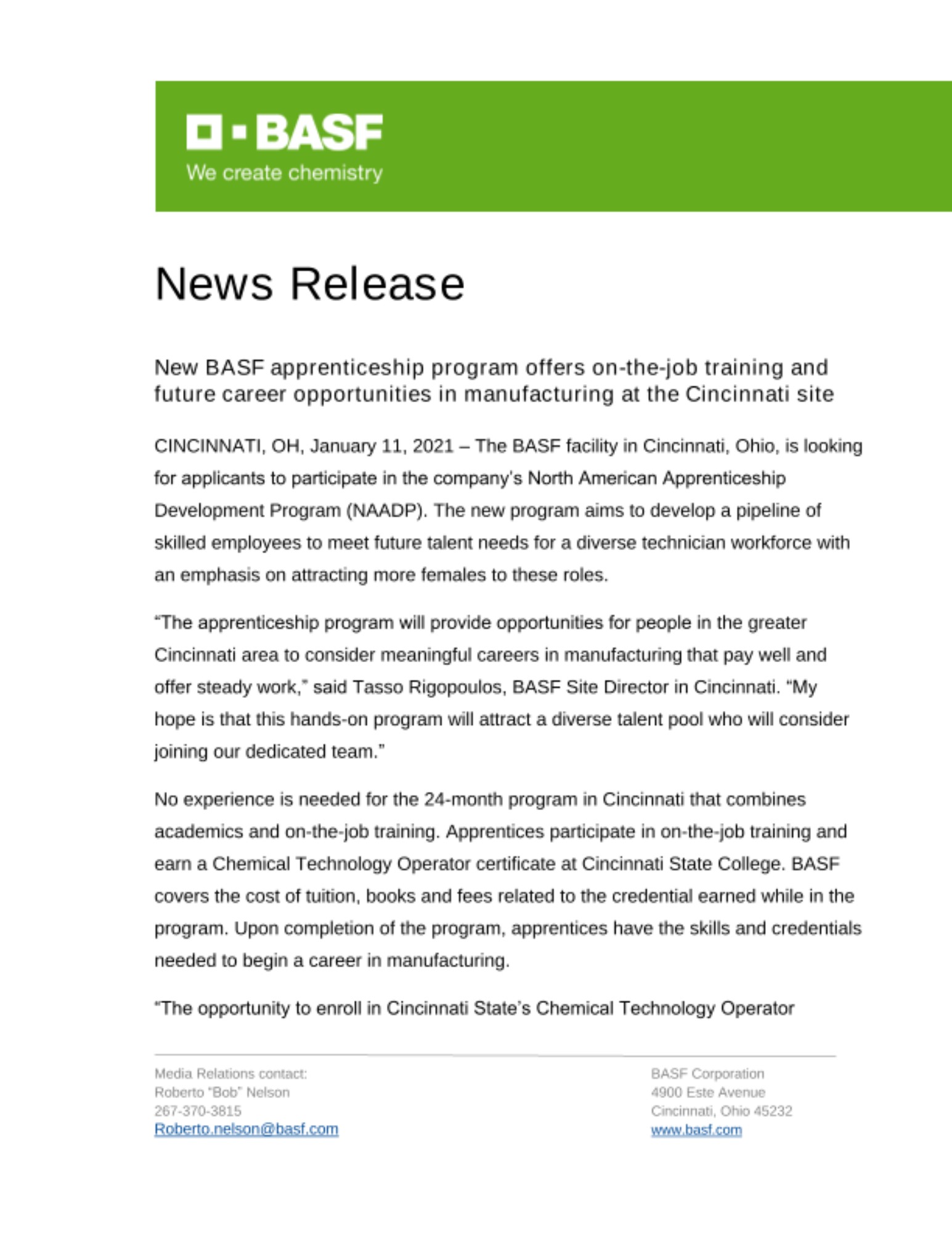 “The apprenticeship program will provide opportunities for people in the greater Cincinnati area to consider meaningful careers in manufacturing that pay well and offer steady work,” said Tasso Rigopoulos, BASF Site Director in Cincinnati. “My hope is that this hands-on program will attract a diverse talent pool who will consider joining our dedicated team.”