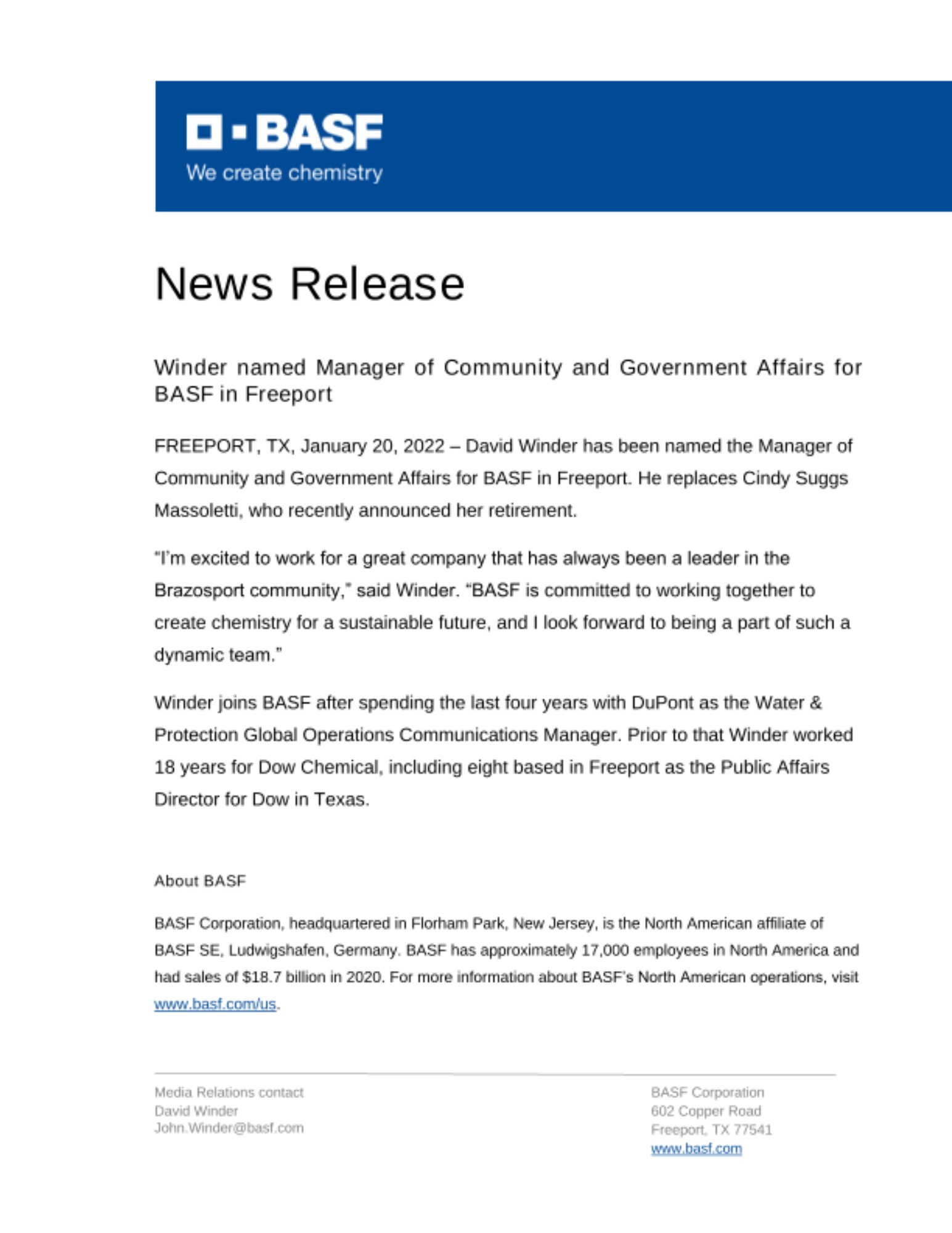 FREEPORT, TX, January 20, 2022 – David Winder has been named the Manager of Community and Government Affairs for BASF in Freeport. He replaces Cindy Suggs Massoletti, who recently announced her retirement.