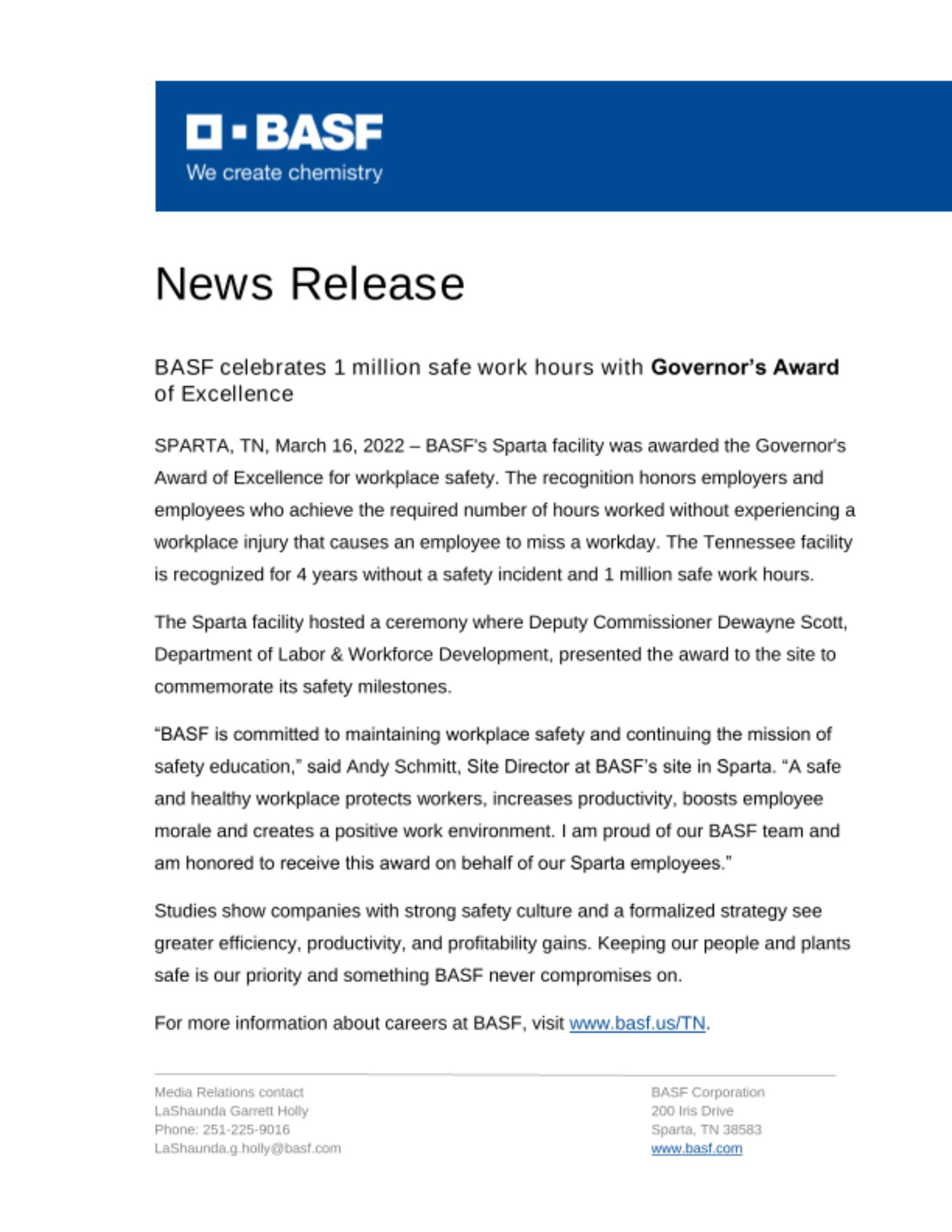 SPARTA, TN, March 16, 2022 – BASF's Sparta facility was awarded the Governor's Award of Excellence for workplace safety. The recognition honors employers and employees who achieve the required number of hours worked without experiencing a workplace injury that causes an employee to miss a workday. The Tennessee facility is recognized for 4 years without a safety incident and 1 million safe work hours.