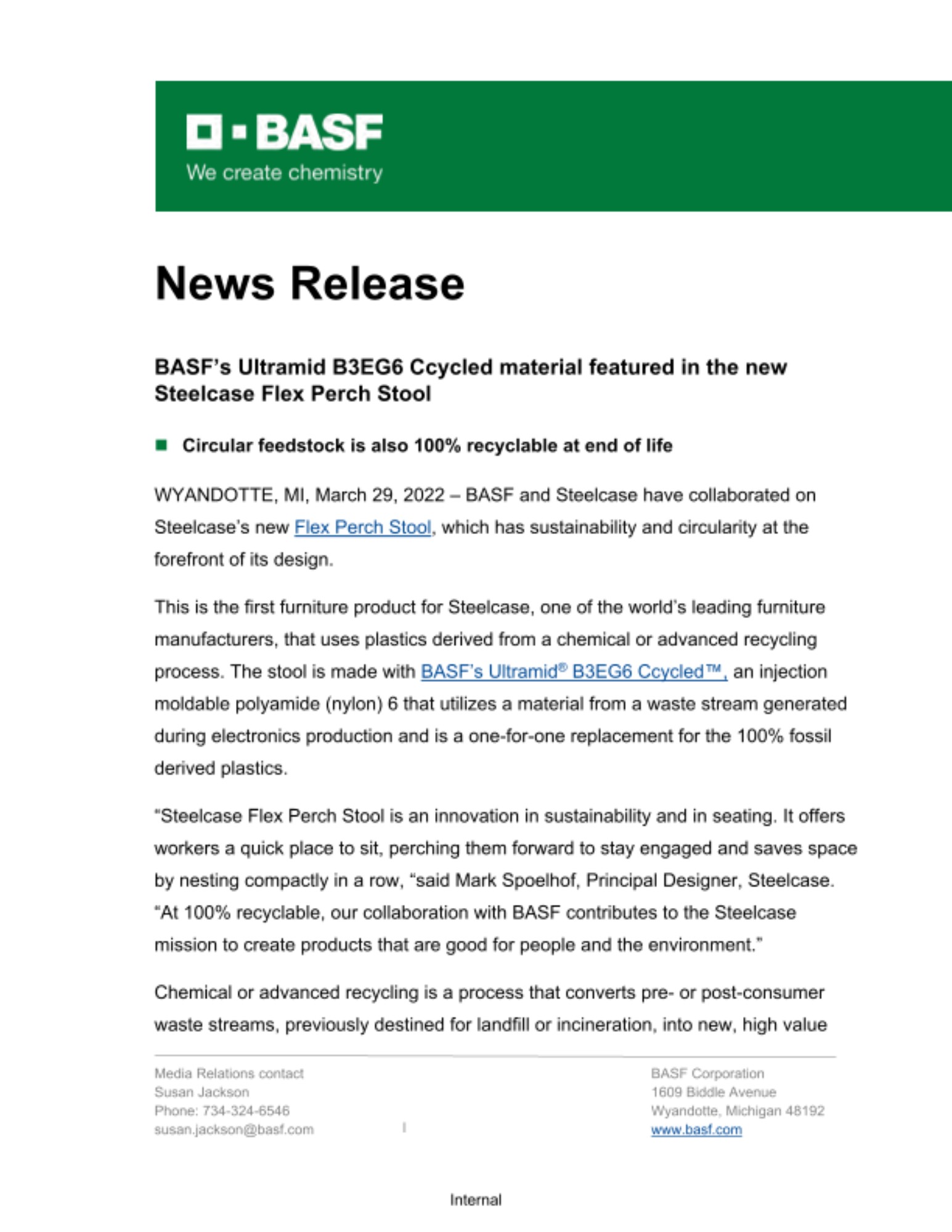 This is the first furniture product for Steelcase, one of the world’s leading furniture manufacturers, that uses plastics derived from a chemical or advanced recycling process. The stool is made with BASF’s Ultramid® B3EG6 Ccycled™, an injection moldable polyamide (nylon) 6 that utilizes a material from a waste stream generated during electronics production and is a one-for-one replacement for the 100% fossil derived plastics.