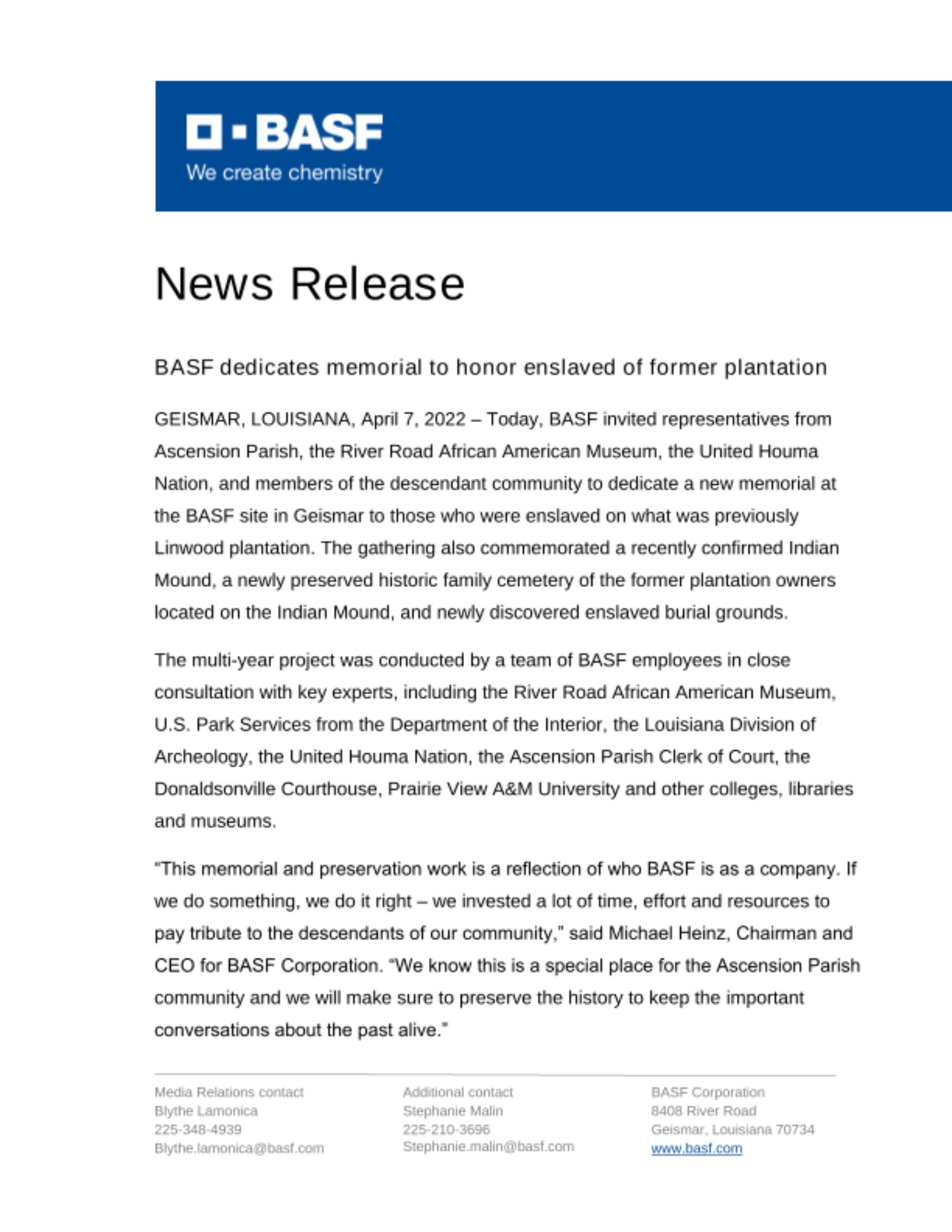 “This memorial and preservation work is a reflection of who BASF is as a company. If we do something, we do it right – we invested a lot of time, effort and resources to pay tribute to the descendants of our community,” said Michael Heinz, Chairman and CEO for BASF Corporation. “We know this is a special place for the Ascension Parish community and we will make sure to preserve the history to keep the important conversations about the past alive.”