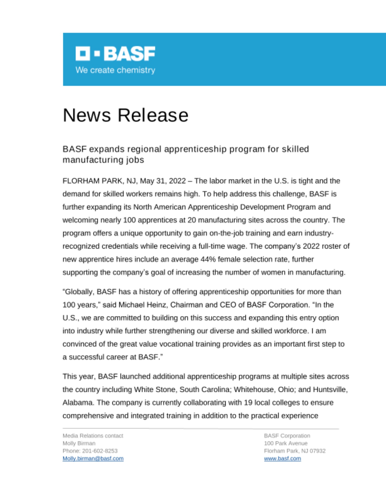 “Globally, BASF has a history of offering apprenticeship opportunities for more than 100 years,” said Michael Heinz, Chairman and CEO of BASF Corporation. “In the U.S., we are committed to building on this success and expanding this entry option into industry while further strengthening our diverse and skilled workforce. I am convinced of the great value vocational training provides as an important first step to a successful career at BASF.”