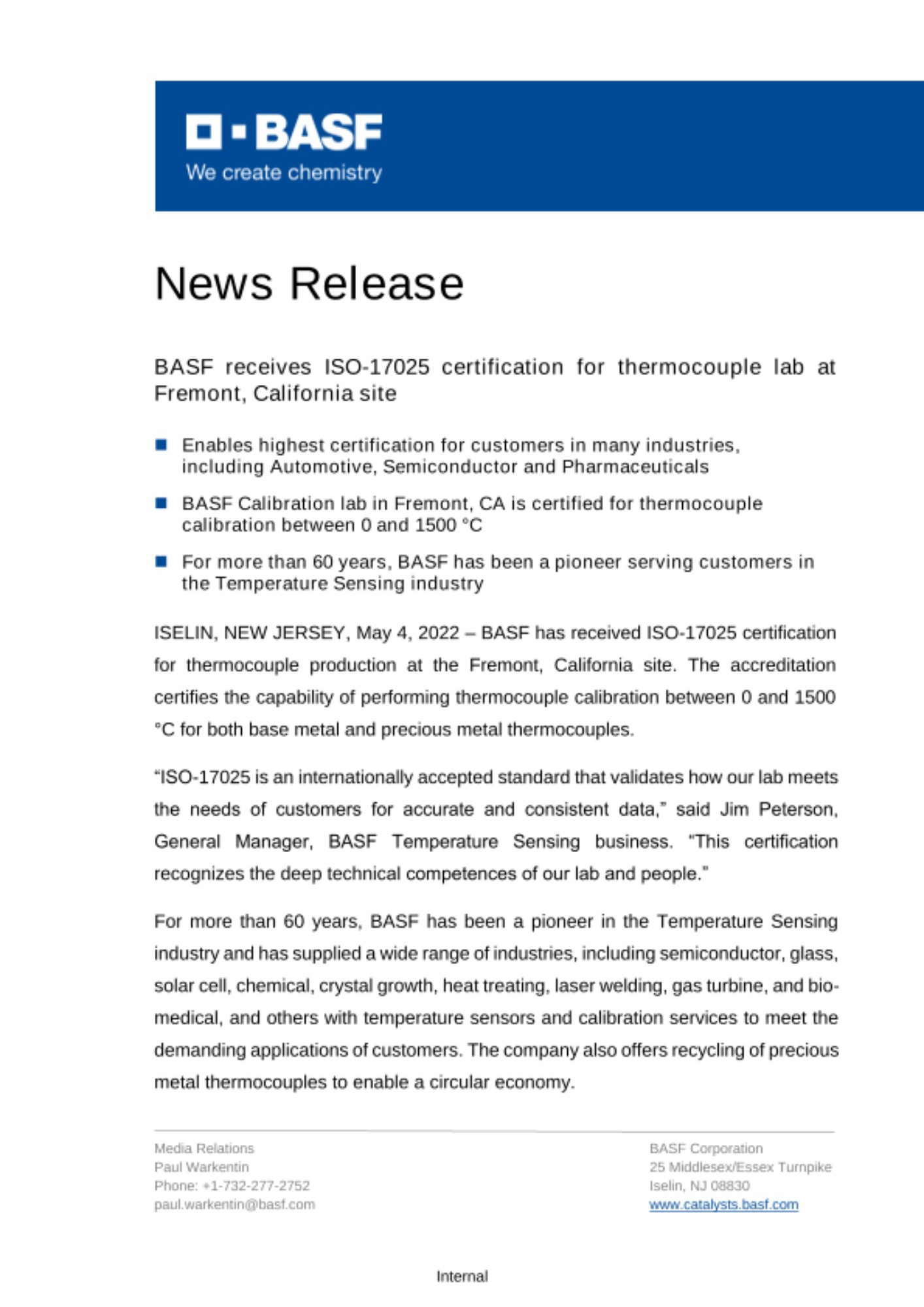 “ISO-17025 is an internationally accepted standard that validates how our lab meets the needs of customers for accurate and consistent data,” said Jim Peterson, General Manager, BASF Temperature Sensing business. “This certification recognizes the deep technical competences of our lab and people.”