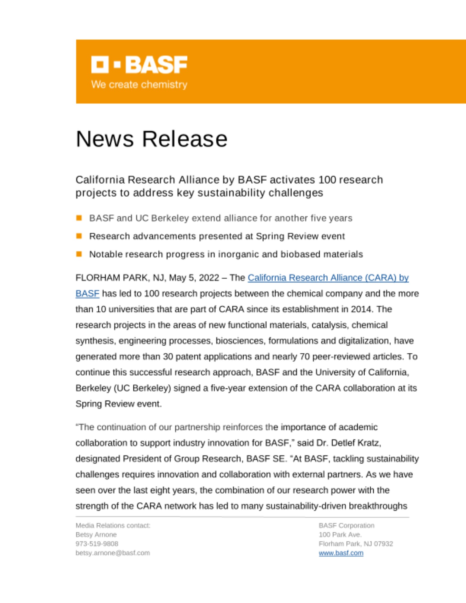 FLORHAM PARK, NJ, May 5, 2022 – The California Research Alliance (CARA) by BASF has led to 100 research projects between the chemical company and the more than 10 universities that are part of CARA since its establishment in 2014. The research projects in the areas of new functional materials, catalysis, chemical synthesis, engineering processes, biosciences, formulations and digitalization, have generated more than 30 patent applications and nearly 70 peer-reviewed articles. To continue this successful research approach, BASF and the University of California, Berkeley (UC Berkeley) signed a five-year extension of the CARA collaboration at its Spring Review event.