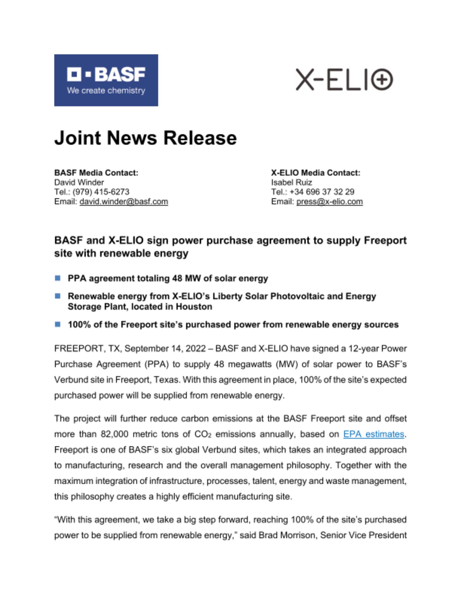 FREEPORT, TX, September 14, 2022 – BASF and X-ELIO have signed a 12-year Power Purchase Agreement (PPA) to supply 48 megawatts (MW) of solar power to BASF’s Verbund site in Freeport, Texas. With this agreement in place, 100% of the site’s expected purchased power will be supplied from renewable energy.