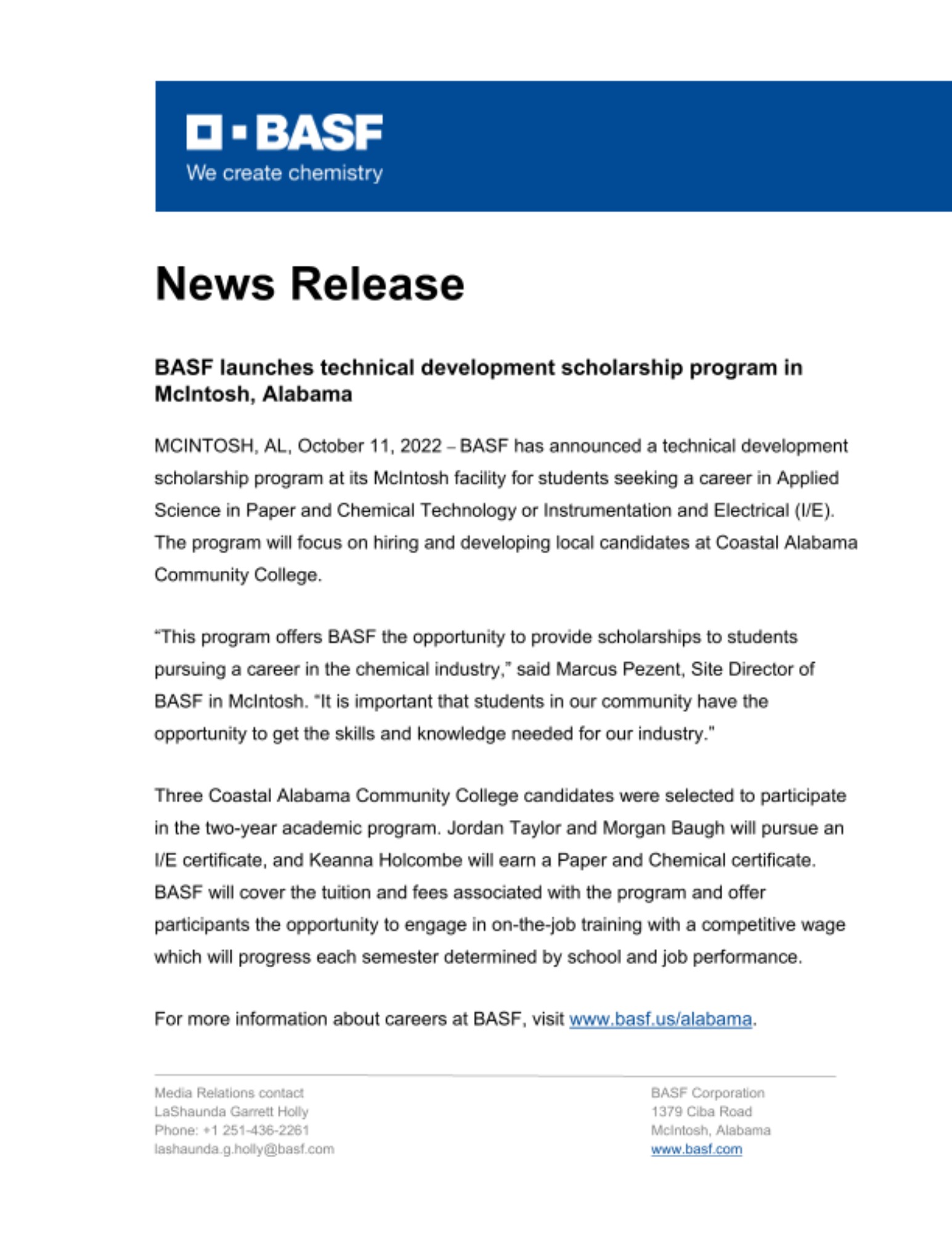 MCINTOSH, AL, October 11, 2022 – BASF has announced a technical development scholarship program at its McIntosh facility for students seeking a career in Applied Science in Paper and Chemical Technology or Instrumentation and Electrical (I/E). The program will focus on hiring and developing local candidates at Coastal Alabama Community College.