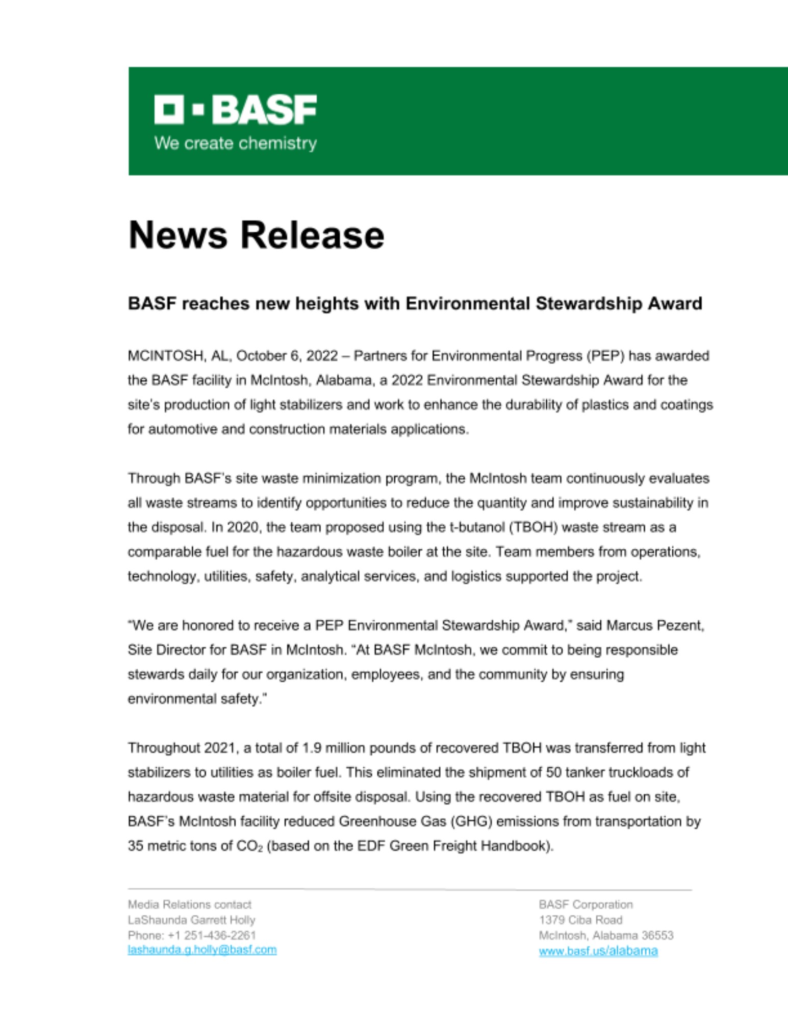 MCINTOSH, AL, October 6, 2022 – Partners for Environmental Progress (PEP) has awarded the BASF facility in McIntosh, Alabama, a 2022 Environmental Stewardship Award for the site’s production of light stabilizers and work to enhance the durability of plastics and coatings for automotive and construction materials applications.