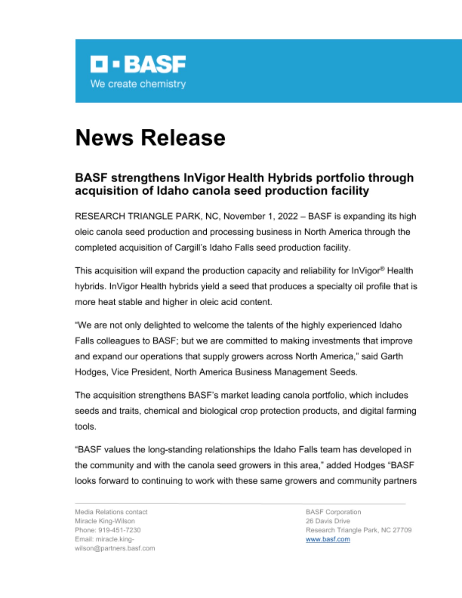 RESEARCH TRIANGLE PARK, NC, November 1, 2022 – BASF is expanding its high oleic canola seed production and processing business in North America through the completed acquisition of Cargill’s Idaho Falls seed production facility.