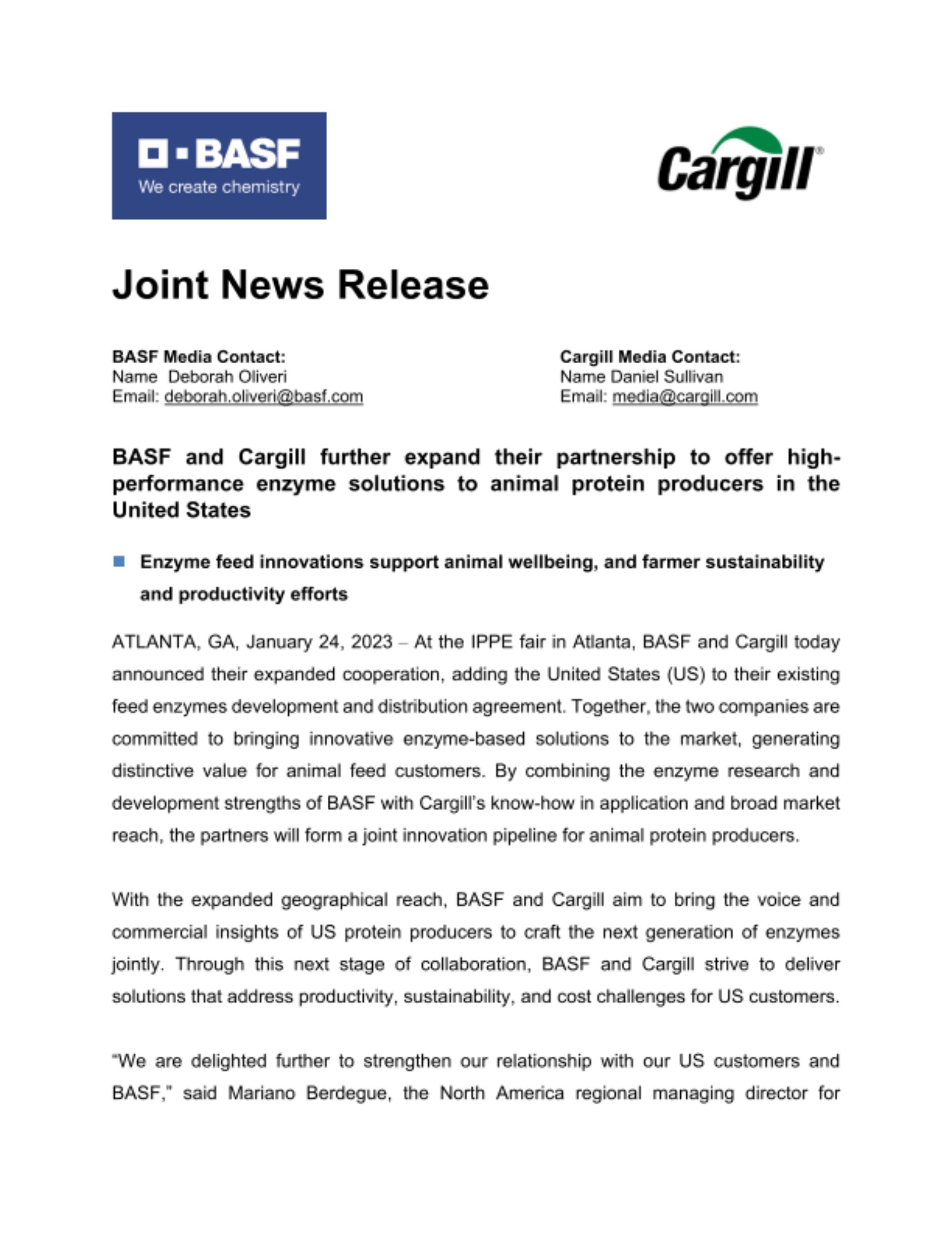 ATLANTA, GA, January 24, 2023 – At the IPPE fair in Atlanta, BASF and Cargill today announced their expanded cooperation, adding the United States to their existing feed enzymes development and distribution agreement. Together, the two companies are committed to bringing innovative enzyme-based solutions to the market, generating distinctive value for animal feed customers. By combining the enzyme research and development strengths of BASF with Cargill’s know-how in application and broad market reach, the partners will form a joint innovation pipeline for animal protein producers.
