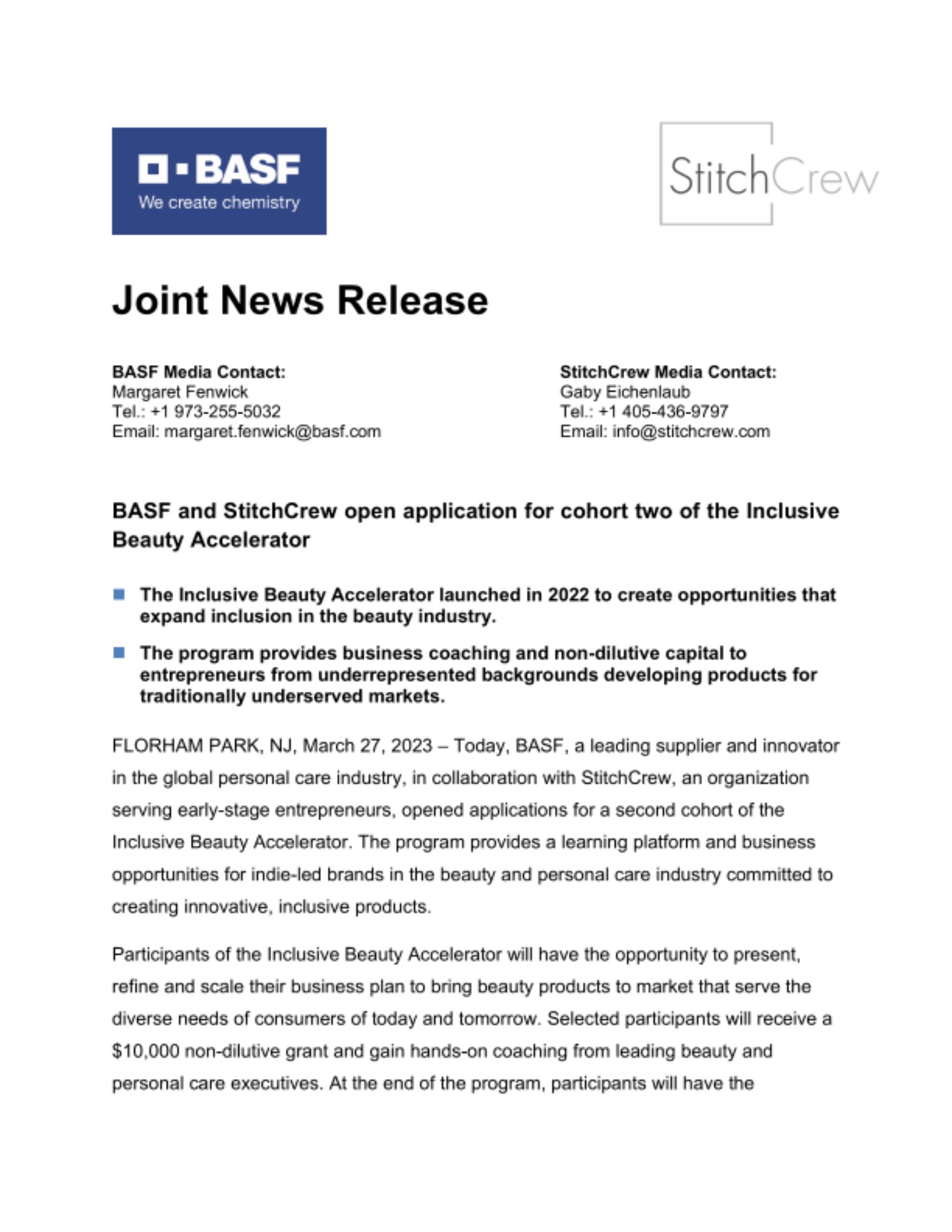Participants of the Inclusive Beauty Accelerator will have the opportunity to present, refine and scale their business plan to bring beauty products to market that serve the diverse needs of consumers of today and tomorrow. Selected participants will receive a $10,000 non-dilutive grant and gain hands-on coaching from leading beauty and personal care executives. At the end of the program, participants will have the opportunity to showcase their products to Consumer Packaged Goods (CPG) investors, StitchCrew and BASF extended networks.