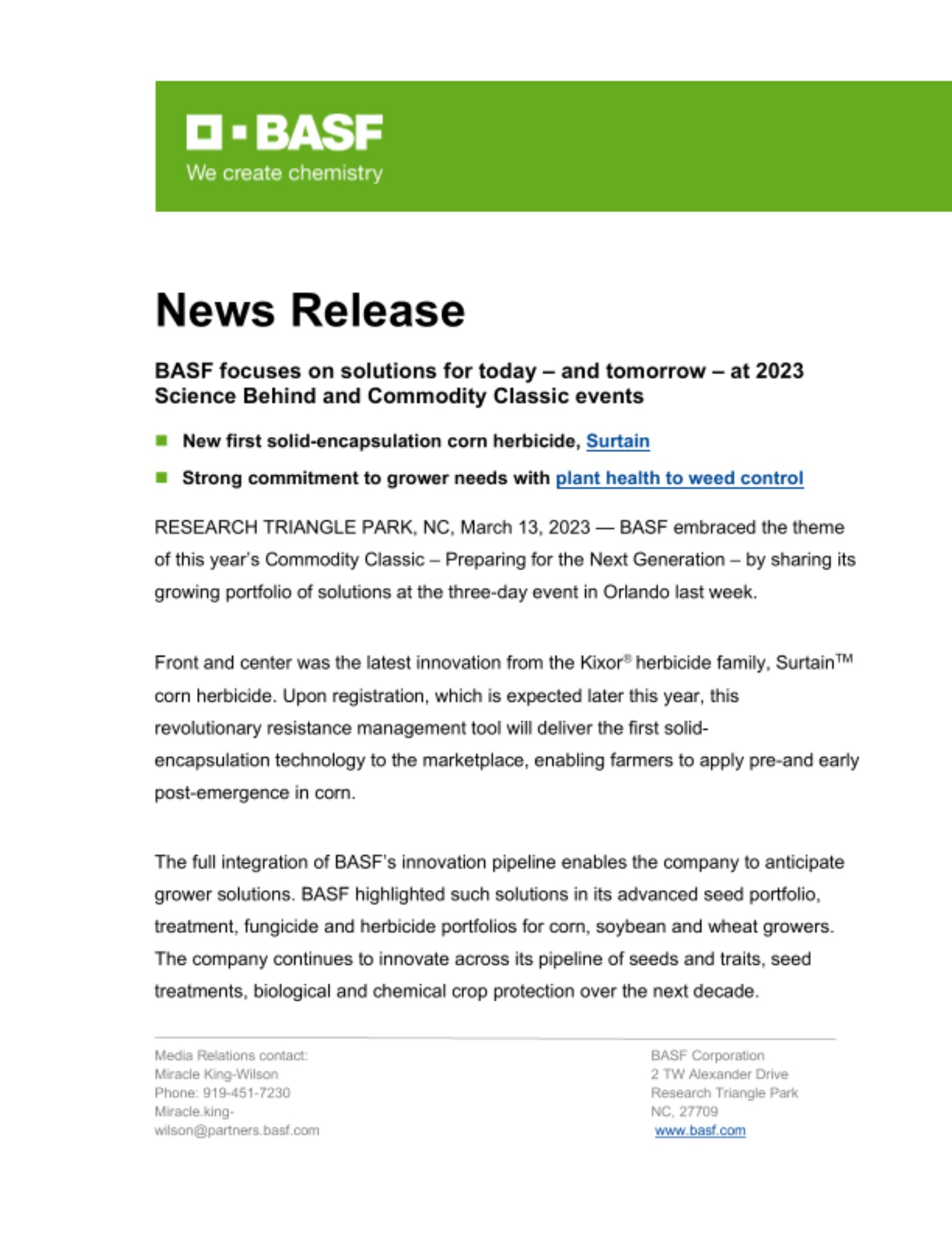 RESEARCH TRIANGLE PARK, NC, March 13, 2023 — BASF embraced the theme of this year’s Commodity Classic – Preparing for the Next Generation – by sharing its growing portfolio of solutions at the three-day event in Orlando last week.