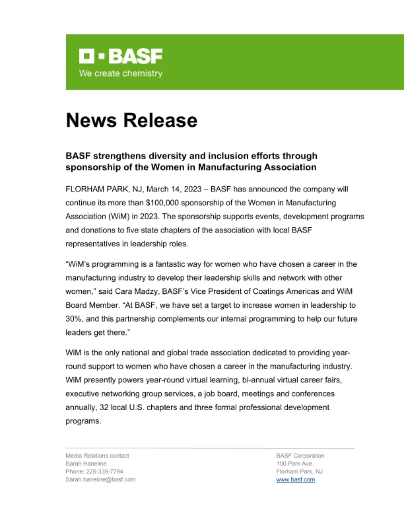 FLORHAM PARK, NJ, March 14, 2023 – BASF has announced the company will continue its more than $100,000 sponsorship of the Women in Manufacturing Association (WiM) in 2023. The sponsorship supports events, development programs and donations to five state chapters of the association with local BASF representatives in leadership roles.