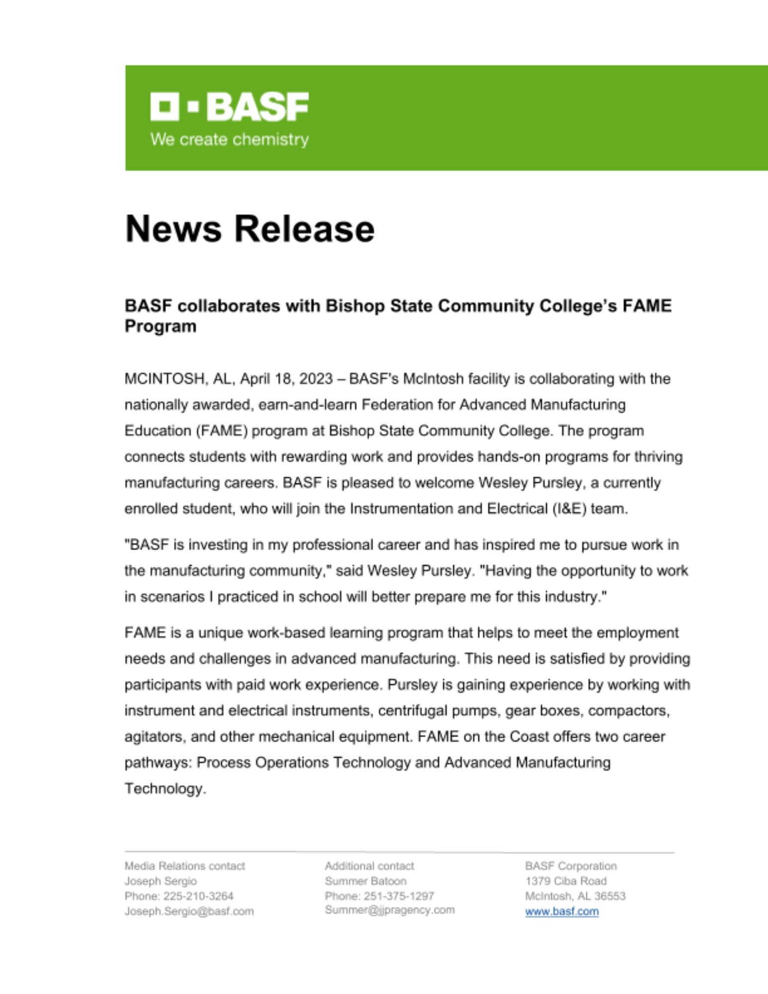 MCINTOSH, AL, April 18, 2023 – BASF's McIntosh facility is collaborating with the nationally awarded, earn-and-learn Federation for Advanced Manufacturing Education (FAME) program at Bishop State Community College. The program connects students with rewarding work and provides hands-on programs for thriving manufacturing careers. BASF is pleased to welcome Wesley Pursley, a currently enrolled student, who will join the Instrumentation and Electrical (I&E) team.