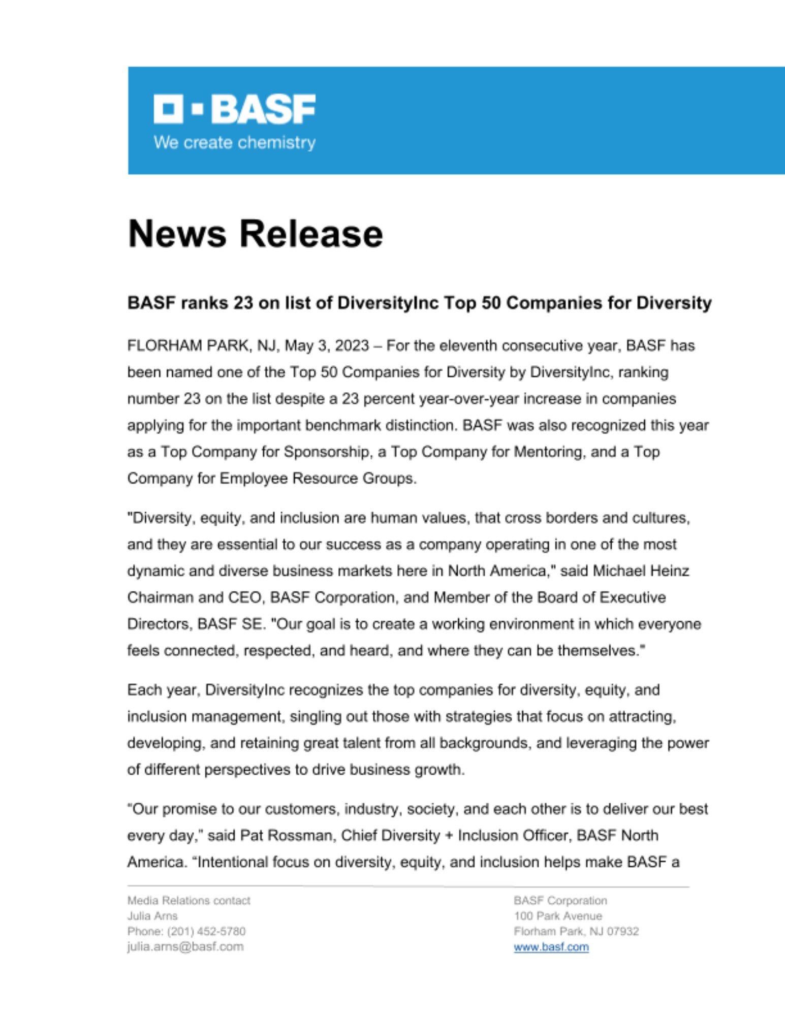 "Diversity, equity, and inclusion are human values, that cross borders and cultures, and they are essential to our success as a company operating in one of the most dynamic and diverse business markets here in North America," said Michael Heinz Chairman and CEO, BASF Corporation, and Member of the Board of Executive Directors, BASF SE. "Our goal is to create a working environment in which everyone feels connected, respected, and heard, and where they can be themselves."