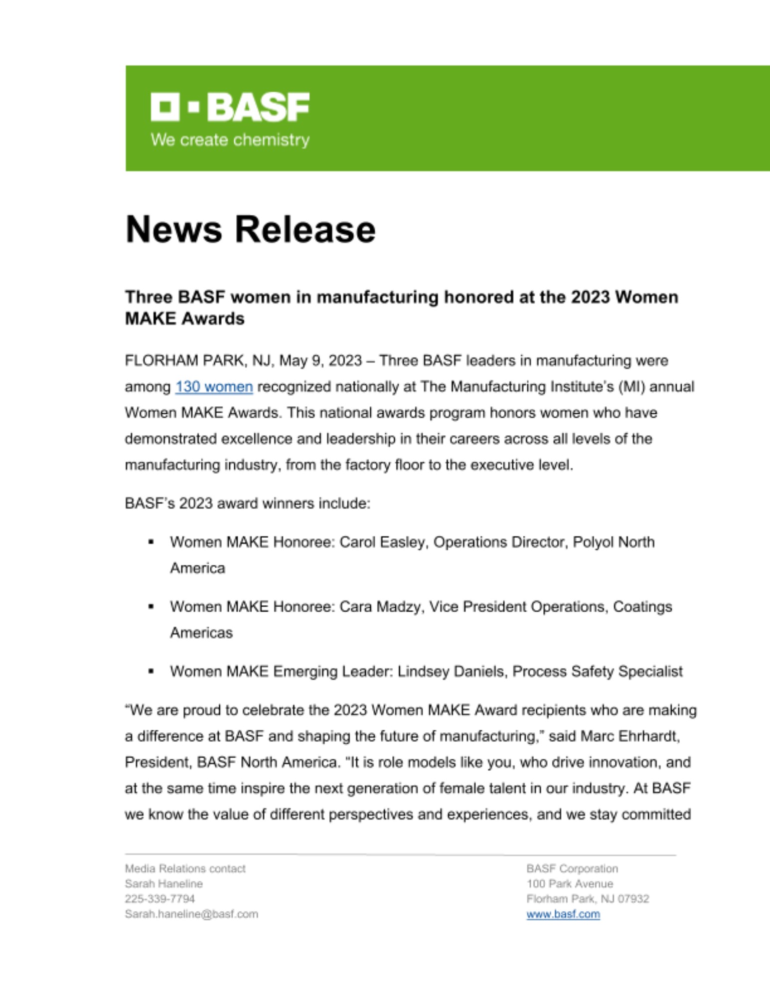 “We are proud to celebrate the 2023 Women MAKE Award recipients who are making a difference at BASF and shaping the future of manufacturing,” said Marc Ehrhardt, President, BASF North America. “It is role models like you, who drive innovation, and at the same time inspire the next generation of female talent in our industry. At BASF we know the value of different perspectives and experiences, and we stay committed to attracting, developing, and retaining great female talent.”