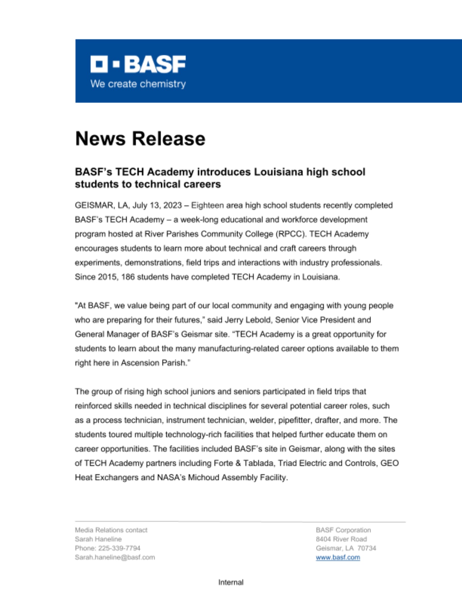 "At BASF, we value being part of our local community and engaging with young people who are preparing for their futures,” said Jerry Lebold, Senior Vice President and General Manager of BASF’s Geismar site. “TECH Academy is a great opportunity for students to learn about the many manufacturing-related career options available to them right here in Ascension Parish.”