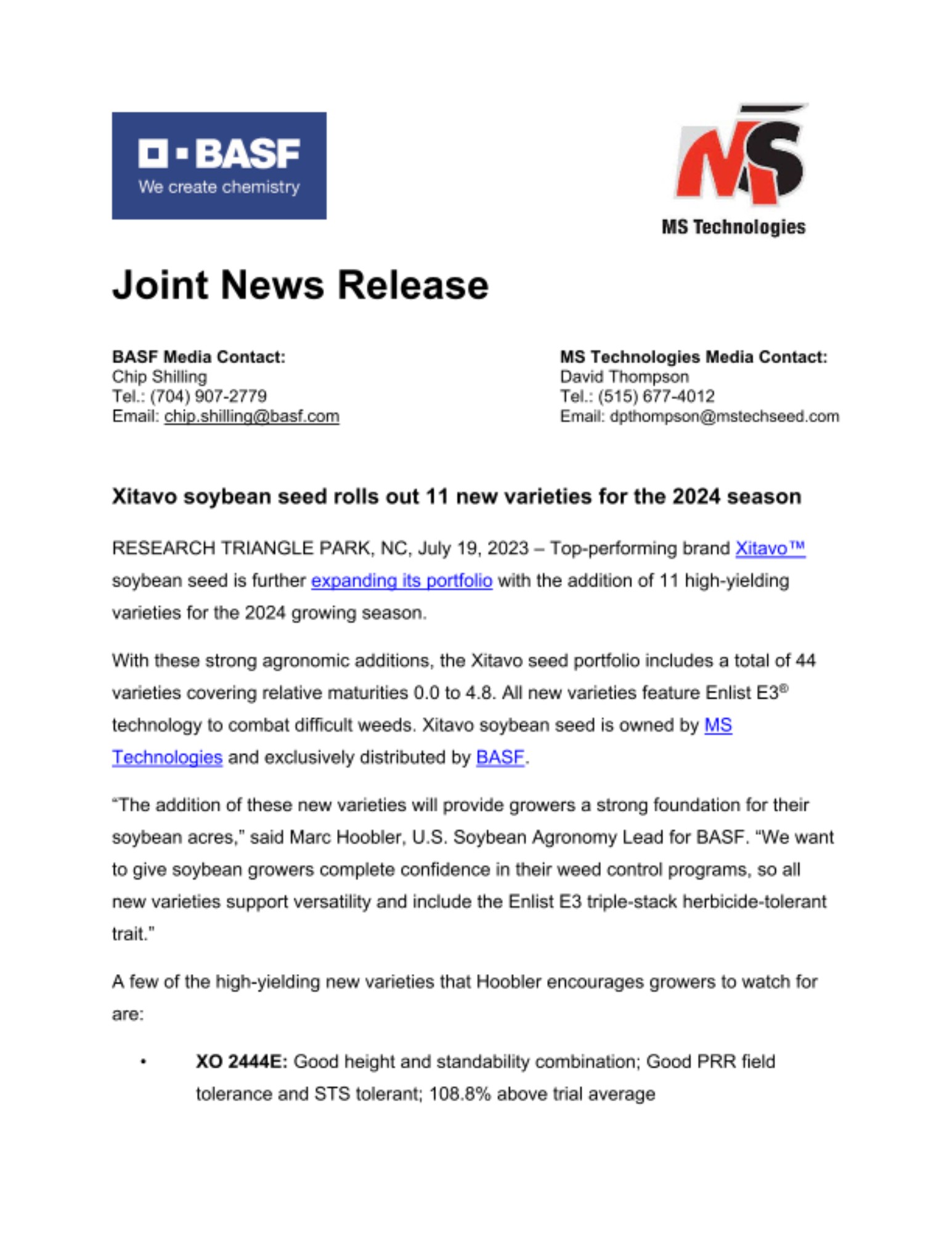 With these strong agronomic additions, the Xitavo seed portfolio includes a total of 44 varieties covering relative maturities 0.0 to 4.8. All new varieties feature Enlist E3® technology to combat difficult weeds. Xitavo soybean seed is owned by MS Technologies and exclusively distributed by BASF.