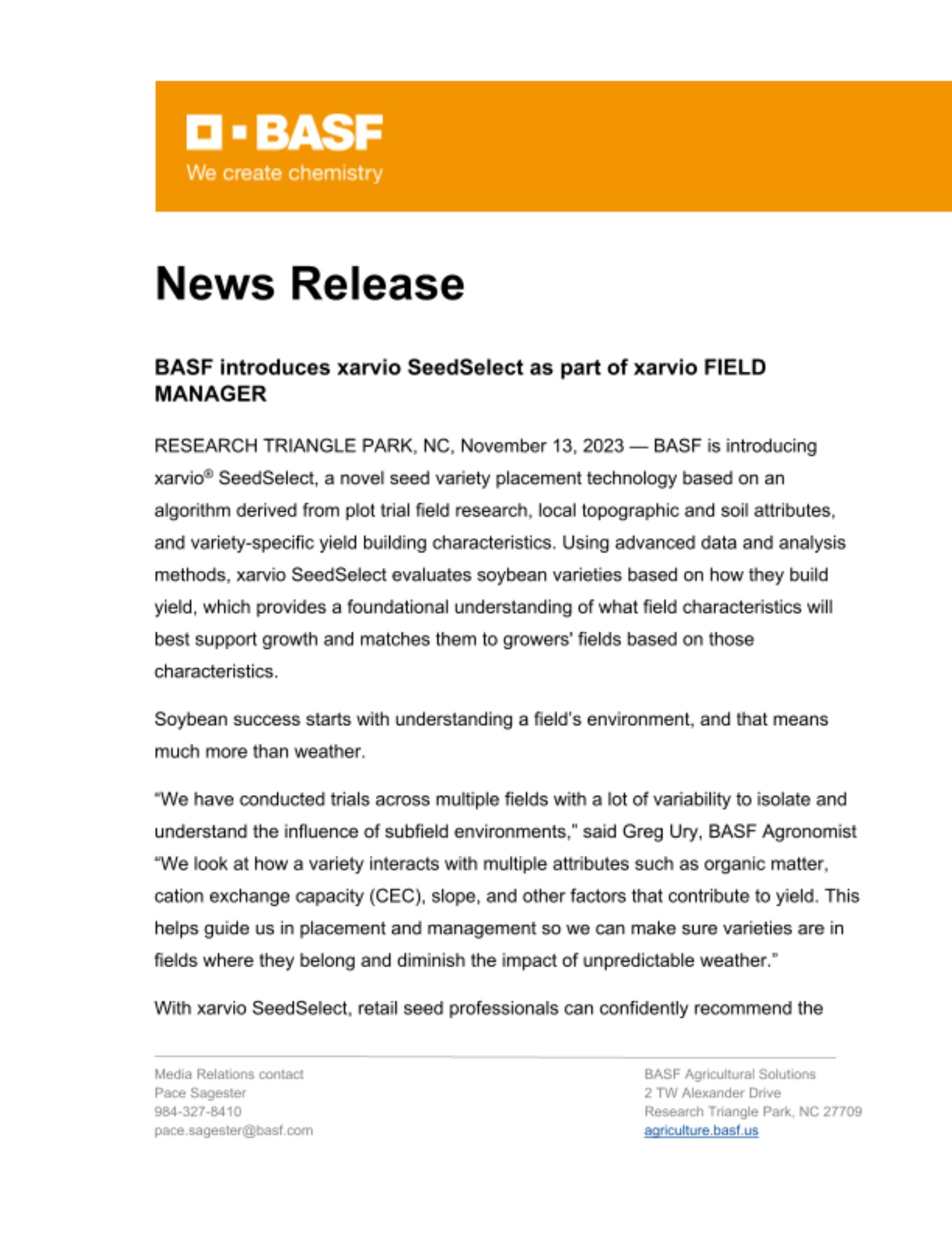 RESEARCH TRIANGLE PARK, NC, November 13, 2023 — BASF is introducing xarvio® SeedSelect, a novel seed variety placement technology based on an algorithm derived from plot trial field research, local topographic and soil attributes, and variety-specific yield building characteristics. Using advanced data and analysis methods, xarvio SeedSelect evaluates soybean varieties based on how they build yield, which provides a foundational understanding of what field characteristics will best support growth and matches them to growers' fields based on those characteristics.